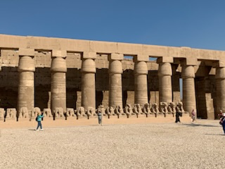 Our first stop was at the Karnak Temple Complex, which was built by various pharaohs, but one of the principal ones was Ramses II who ruled for several decades during the heyday of the Egyptian civilization. The immediate impression of the location was the enormity of the place. The sheer size of the entry bastions / walls or pylons resemble 40 story high, 20 feet thick and 60 feet long, solid stone skyscrapers. Entry to this “outer Courtyard” is passing the ram head series of some 50 sphinx statues. There was a 2 mile roadway lined by sphinxes form the Temple of Luxor to Karnak. Passing through the entry or 1st Pylon into the Great Forecourt or enclosed courtyard one sees the “work in progress” of the pylon (front wall) as the ramp from antiquity used to haul the stone to the top of the wall is plainly visible. Also the first column on the right hand side, upon entering, consists of square blocks placed on top of each other, the second column shows that these square blocks underwent some rounding off of the square and the final columns showed the polished column with hieroglyphs and images in color, still visible today several millennia later. A 40 foot high carved statue of Ramses III and his main wife (at his feet) is in the center as well as several other structures like the alabaster Seti III altar and the Ramses III temple. This courtyard was a relatively late addition to the complex as it was added between the 14th and 11th centuries BCE. The second pylon was built 1333-1306 BCE and other monuments added in 1200 BCE.