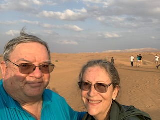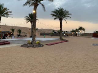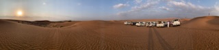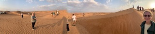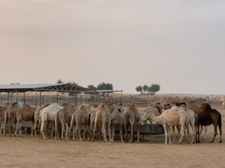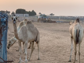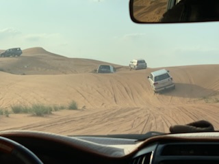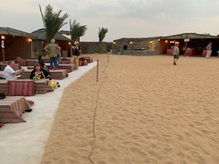 After doing our “due diligence” we soon were at the Khatam exit to Melina Drive, where we passed through an entrance in the barbed wire fence. All the cars were now lined up in numerical order and the drivers got out and deflated the car tires, to get greater traction on the sand. Soon we were on the sand in the Arabian Desert, going up and down the dunes. Some were high and the car needed to speed up to get to the top, but at the top some fell off sharply on one side or the other, Others we could see vehicles in front of us going down a very steep hill sliding sideways down the 300 – 400 meter high dune. A scary but enthralling experience and the driver did a terrific job. We noted the large “roll bar” over the roof, in case the car rolled over, our heads would not be crushed. This half hour thrilling experience, Arabic music blaring, and us holding on for dear life suddenly came to a stop where we were able to get up and gaze at the beauty of the sun fading over the vast expanse of the desert with nothing but sand dunes all around us. An unforgettable experience. After some 20 minutes gazing upon this glory of nature, during which time the drivers re-inflated their tires from machines in their respective boots / trunks, we were off to another part of the desert where some 300 camels were in pens ready to be hired for travel into the desert.