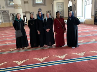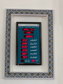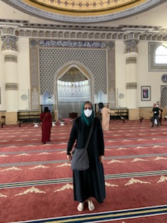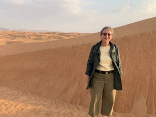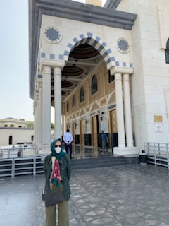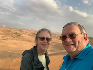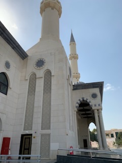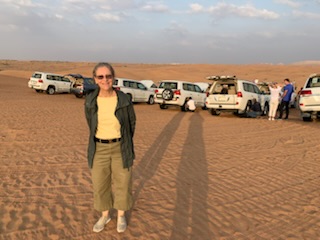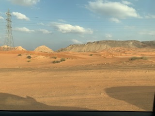 After the meal we went to the largest (Suni) Mosque in Dubai (Al Farooq bin Alkthattab Masjid) that can accommodate 2,400 people, men and women separately and the ladies all had to put on the long flowing black “abayas”. It was great to see Anne fully kited out and we took pictures in the mosque with the other ladies. It was built in 1986, expanded in 2003 and rebuilt in 2011. Interesting was the difference of 13 days between the Arabic Calendar and Gregorian Calendar we use, making both back in synch after 33 years. So at 33, the same person in the Islamic calendar is 34 years old. Currently the date is 9.7.1444 (when we were in Abu Dhabi) as it dates from Mohamed not Jesus Christ. By this time we were getting concerned as we had told our guide that we had to be back on time (2PM). We had only 1 hour between arrival and departure on the afternoon tour. At 2PM we were still at the Mosque undergoing more and more explanations and 1/2 hour from the port. We eventually got to the ship 10 minutes before the next departure. We ran the full length of the new large port structure as entry and exit from the building are on opposite ends. We made it onto the 10th of 12 – 4X4 Toyota vehicles that were to be the transport for the afternoon tour.