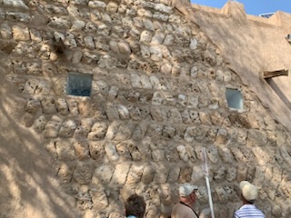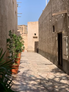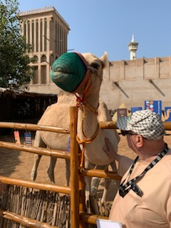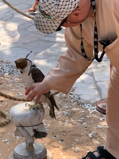 The first tour was “The Cultural Emirati Experience” which took us to the old part of the city – the Al Fahidi Historical Neighborhood, that has various cultural, architectural and antiquities institutions; houses safeguarding the Emirati Heritage such as the old Post Office, Coffee and other museum; artistic houses for professional talents such as Galerys, some retail shops, coffee houses and restaurants, a couple of hotels and a few landmarks such as the Mosque and rock garden. (www.cultures.ae) Dubai was a small fishing and pearl diving village some 60 years ago. One man on the tour had been here doing oil exploration in 1967 and verified that it was a “nothing” village. We later saw photographs of the village that was Dubai during our lifetime. We visited and petted / kissed a camel and her baby and other exhibits of life in the fishing village. One of the exhibits was a 1971 oar powered boat (78 rowers), owned by the late sheikh Makotum bin Rashid Al Maktoum and from 1972 to 1992 was the winner in all the races of it’s class. We were introduced to a live falcon, which is the national bird as falconry is a very important part of the Emirates culture. As a bird of prey they are treated with great reverence. Anne mentioned that she was on a Royal Jordanian flight once where half a dozen falcons each had first class seats on the plane! We saw a typical Bedouin family living area with it’s cooking fire and “tent” with cushions. The “Tent” / covering was called the House of Hair Making (Bait Al Sha’ar) as the covering (which lasted about 50 years) was made from goat hair that women would find on shrubs in the desert and then knit together into pieces. It was then tied down with ropes to protect the occupants against the elements. We wandered the streets of the old adobe housed village that has been completely restored and is really a tourist attraction, but very well done as it gives one a very good idea of what the village was like.