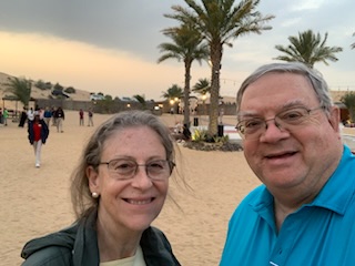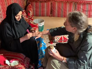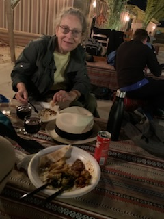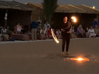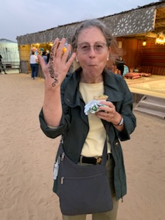 Next to our final stop of the day, a Bedouin camp site (owned and set up by the travel company that Cunard uses in the country – Orient Tours). A large complex consisting of a group of some 10 covered areas each seating some 50 people at tables with cushions on the floor (a few chairs for those of us that have difficulty getting up after sitting on the floor, were found). On the other side were cooking areas, buffet style serving area, drinks area as well as henna tattoo lady (Anne got a scroll tattoo on her hand), a few shops (one doing sand bottles with your name) and other shops, public conveniences etc. In the center was a raised platform where we experienced a fire dance, belly dancing and other such dramatic Arabian dance exhibits. We enjoyed the dinner and show under the desert skies. When the lighting in the compound was off the moon and stars in the pitch black desert sky were spectacular. A terrific day.