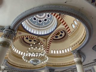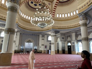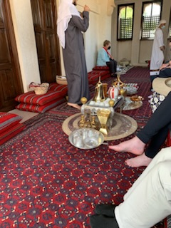 The big attraction of the morning tour, however, was the “curated” meal. We entered the Cultural Center restaurant that had a large downstairs area set up for some 50 guests, but as we were only 15 we went to the upstairs room. After removing our shoes, we entered the (Persian) carpeted room with central tea / coffee service and pillows lining the outside walls of the room, both on the floor as well as against the walls, for the back. We all sat on these cushions and then were greeted by a 23 year old, charming man – Hassan. He walked us through what it was to have a family meal at home and answered many questions about what life is like for locals. He is from Abu Dhabi but works in Dubai and described clothing, the three head coverings – cap, white or red & white cloth and the black rope holding the cloth on (historically it was used to tie the camel’s feet together so they would not wander off into the desert). The long flowing cotton one piece covering with tassel (used to place perfume on so as to smell when unpleasant odors are in the air) and the undergarment which can either be a loose fitting cotton trousers or a slip. This “slip” takes the place of underwear. He also talked about what it was like to go about getting married which is typically arranged, but with a great amount of input from the individual. Once the boy decides it is time to get married, the mother then arranges, with her friends and family to have a list of possible alternatives. One is selected and mother & son go and visit the woman and her mother. After some discussions, it can lead to nothing or a second meeting. Always with the parent in attendance. Eventually if it goes to the next step, a “dating’ period is defined, about 6 months and formalized. At the end of that time, either one can back out, but if they want to continue to be married, they have to talk independently to the person who would legally authorize the marriage and if all is still a go, would lead to the ceremony itself. Under Muslim law, a man can take up to 4 wives, but all have to be treated exactly the same. This was mostly in the olden days of farming, where more children would be needed to help, than one wife could produce. So most men now only have one wife. “Love Marriages” are also allowed, but say a boy and girl meet at university and decide it would be good to marry, the mothers are contacted and the same procedure followed. Usually the first wife is always from the Emirates, but if there is a second wife, she may be from overseas. This is unlike Oman where men are free to marry women of any nationality.