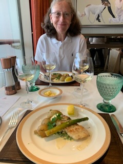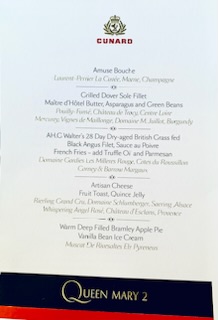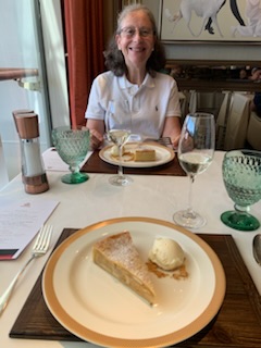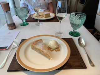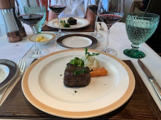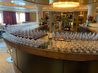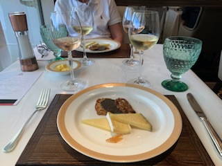 The lunch in the Verandah Restaurant, we had signed up for, was put on by the sommeliers and was an education about wines. Ekaterina (Katia), our friend, was superb giving us not only instruction about the French wines, but also the regions of France that produce the wines and the type of soil / substrate that produces the type of wine. From the Loire Valley to Bordeaux (Borde de L’eau – by the side of the water), to Alsace, Sancerre etc were covered. We learned a lot, but after 8 glasses of wine, I’m not sure what we remember.
