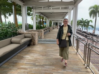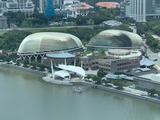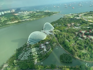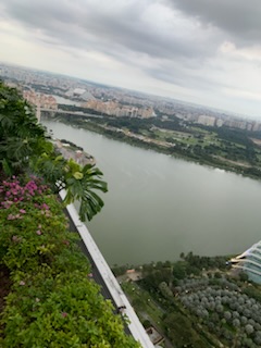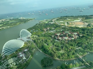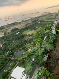 Having been duly entertained and seeing Singapore at night over the by area, we returned to the pool deck as we had dinner reservations at 9:15at LAVO, the Italian restaurant, situated at what would be the aft end of the top structure that resembles a ship. A view over the city, the bay on one side and the ocean on the other was spectacular. The shrimp cocktail seemed more the size of small lobsters rather than shrimp. The waiter suggested that the portions are large so we shared one each – appetizer, salad and main course and were more than satisfied. The day ended with on-line Zoom meetings with New York at midnight.