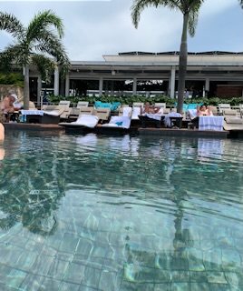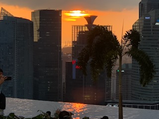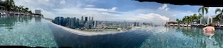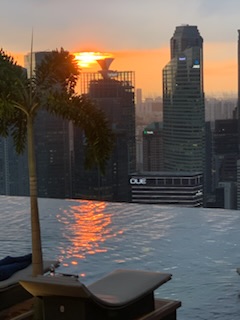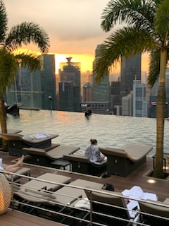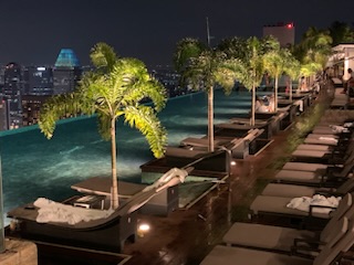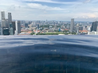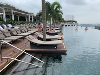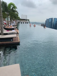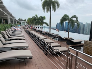 We checked in and were told that our room was not ready but we were given temporary cards to go up to the pool area, which we did after booking dinner tonight and “Lunch” tomorrow. The view was amazing and the 100+ meter long 10 meters wide infinity pool, was spectacular. We had planned on wandering around the Marina Bay Area, but after seeing the price of the room we decided to take full advantage of all the hotel amenities and as soon as we got our suite, on the 49th floor (4901) overlooking the bay, we changed and spent the day at the pool. It is deceiving in many ways but spectacular. Palm trees lined one side of the pool with pairs of lounging chairs, some having their base in the water and others on dry land, and a small table in between. There are three rows of these chairs each on a higher level overlooking the pool and the city landscape around the Marina Bay Area, mostly built on reclaimed land. Above these three rows of chairs running the full length of the top with restaurants along the way as well as lifeguards, towel stations etc. are hot tubs and lounging areas overlooking the gardens by the bay and ocean.