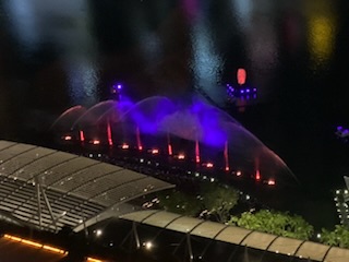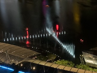 We remained in our bathing outfits, overlooking the ocean until 7:45pm when the light show on the metal “trees” started and had played out. We then went down the 7 floors to our room to see the 8:00PM light / fountain show outside the Marina Sands hotel and Convention Center. It was really quite unique with water forming a 20 foot high ring that changed colors, with dancing fountains in two transecting lines each having some 50 fountains again all with a light show.