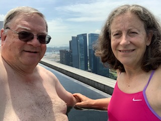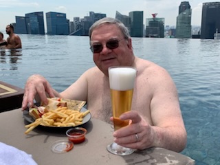 Soon after we had settled in our lounge chairs, with base in the water, meaning you had to step into the pool with water just above the ankles to get into the lounging chairs, a waiter came up and we ordered a pitcher of beer and lunch. While that was being prepared we waded into the pool, only about 4 feet deep, to the “cliff” – the end of the infinity pool. The water from the pool is continuously being re-cycled and it flows over the edge of the pool into a trough that carries the water to be filtered and recycled. The open side of this structure some 8 feet lower is a maintenance walkway permitting any repairs to be made along the way. However looking from the poolside, it definitely appears that there is nothing but a 57 story drop to the ground floor! We enjoyed our lunch and drinks and were in and out of the pool there rest of the day, but had forgotten the sun cream on the ship so we were bright red by the time we went back to our room to shower and get ready for dinner.