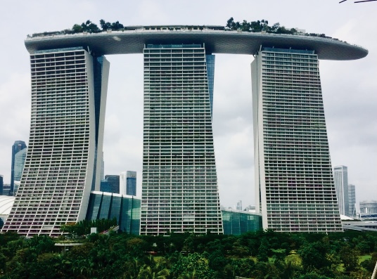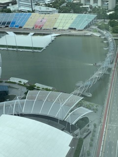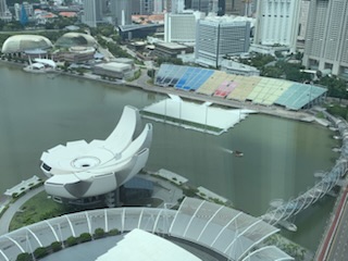 We had decided some time ago that as we both had been to Singapore various times and Anne worked here some 10 years ago, that we would not take any tours, but rather book into a local hotel overnight and enjoy 2 days in the Port. Last time we were in Singapore, before traveling to Malacca, Myanmar (Burma), Andaman Islands and Sri Lanka, we had lunch at the iconic Marina Sands hotel with it’s 3 towers and a roof top connecting the three buildings. We were taken with the roof top infinity pool and determined to say here overnight as only hotel guests are allowed in the pool area.We packed an overnight bag and after breakfast we proceeded ashore. All passengers going ashore had to complete an on-line landing card, providing a lot of information via the ICA app on our phones, 3 days prior to arrival. We had filled out the SG Arrival Card information prior to leaving New York, so had already got all that information registered and3 days before arrival completed the process and got the all important bar code that was necessary to go through immigration. When we finally got to the immigration hall we were greeted by a long snaking queue of guests trying to get through immigration. There were 6 snake lanes and some 50 people in each lane, so it took us over an hour to get through immigration, presenting passports, ICA Arrival Card bar codes and being fingerprinted. A lot of complaining by may of the guests. Once we got through that, there was a further snake queue to get through customs. So it was about 1 1/2 hours from the time we got off the ship until we got onto the shuttle bus to take us to the Marina Sands Convention Center which is opposite the Marina Sands Hotel. Sands is the same group that has hotels in Las Vegas and Palm Springs.