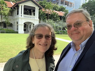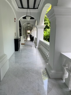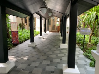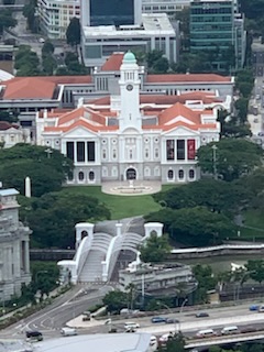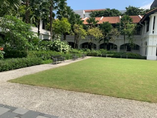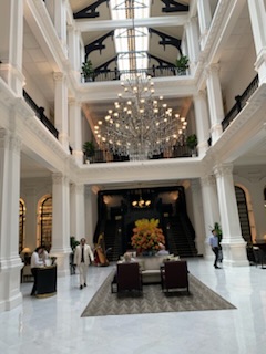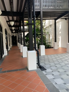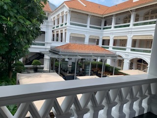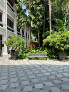 The morning started with breakfast at Wolfgang Puck’s restaurant Spago on the swimming pool floor, followed by a few odds and ends before checking out at 11AM and took a taxi over to Raffles Hotel. The last two times we had been to Singapore it was under renovation and all boarded up. In fact last time we were here on January 25th, 2019, with cousin Judy we did make it to the Long Bar, on the second floor, the place where the Singapore Sling drink was originated. Peanut bags are served in the bar and you are encouraged to peel the peanuts and throw the outside husk on the floor. It is the sight of many a famous person emailing and telling tall stories. This time we didn’t make to the Long Bar as we had to be on the ship by the time it opened. We did, however, as we had luggage for our overnight stay, enter through the main entrance to be greeted by the iconic liveried Sikh doormen, that have greeted guests since it was constructed by Sir Thomas Stamford Raffles, and the white marble and white hotel that covers the entire block.