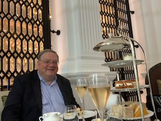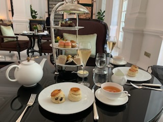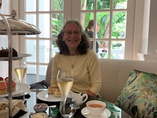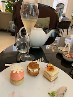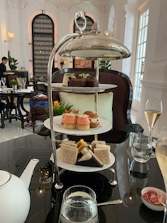 We were able to wander along the passageways and dressed in a blue blazer we seemed to feel we belonged, so despite meeting a lot of staff as we roamed the corridors, all just said good morning and we wandered all around. Eventually finding the fancy shops including the Raffles shop where a little “damage” was done! It was now time for our Valentine’s Day Champagne “High Tea” at 1PM! It was the only time available, so we took the time slot and considered it lunch. A tremendous spread starting each with two scones, clotted cream and jam, followed by a selection of sandwiches and cakes all immaculately served on a triple layer silver structure permitting a plate to rest carefully on each layer with the food. We thoroughly enjoyed the meal, seated in a corner of the Grand Lobby, watching the world go by.