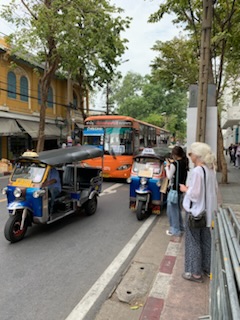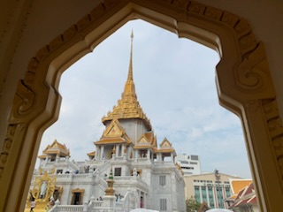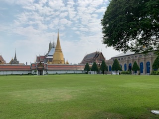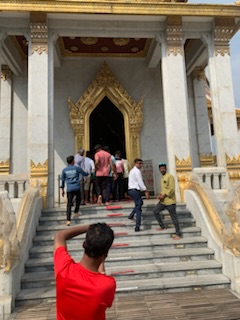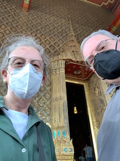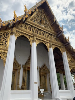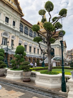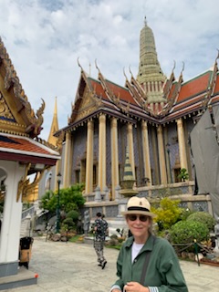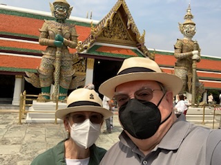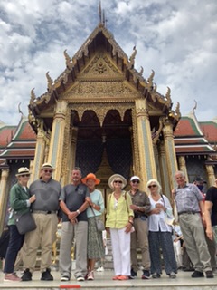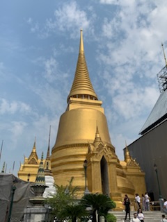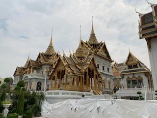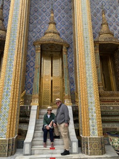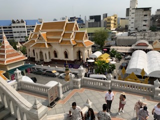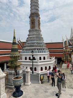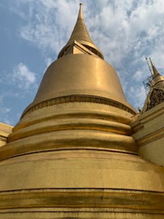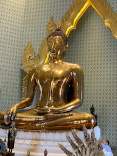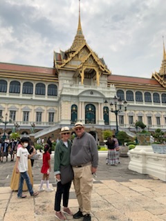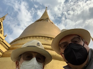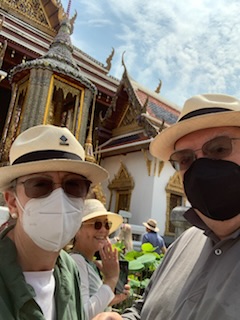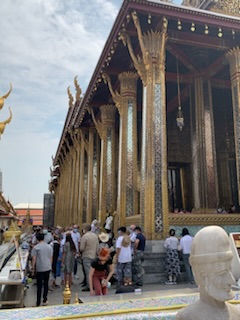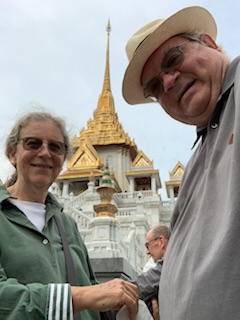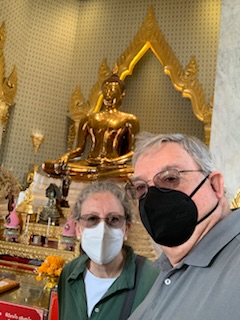 The country, which had never been ruled by an outside country, has a population of 68 million, of which 12 million live in Bangkok. Of the 12MM, 10 million are Thai and the other 2 million foreigners. The country is principally Buddhist (she indicated 50% but others have said up to 95%) with Christian and Muslim coming in equally and then a few of other religions. She also indicated that many young people were born Buddhist, but are converting to Christianity. We saw many Buddhist temples, the odd mosque but did not see any churches. Laem Chabang is the town that has grown up around the port and has a population of 90,000. Most goods entering Thailand go through this container port and it is the 20th busiest port in the world. Thousands of cars assembled here, are waiting at the dock to be transported overseas. Apparently monks, dressed in yellow or orange can be “life” monks or “temporary” monks. If a married man decides to be a monk for a month or more, he can do so, but during that time, he has to live in a monastery, beg for food daily and most importantly cannot even touch a woman even by mistake. So if a woman is walking anywhere near a monk, they have to leave plenty of room for him to pass so they won’t touch. After completing the “Temporary” monk period, he can return to his wife and family and continue his life. Only men can be Buddhist monks, women cannot be nuns. This was contradicted by the guide tomorrow saying that novices and nuns do exist! I’m glad all agree on the same set of facts! There are about 30,000 Buddhist temples in Thailand of which there are 300 in Bangkok. The prior king Rama 9th, was beloved by all and almost worshiped as a god. He ruled for some 70 years and after his death in 2016, his son Rama 10th took over. It is illegal to speak bad of the king, but we know that this king was a playboy living more in Europe than Thailand and was criticized as Crown Prince. We asked the guide who acknowledged that there were stories about his prior behavior, but that he is a very good king and people like him and he is doing good things for the people. He, like Prince / King Charles in England follows in the footsteps of a long reigning, very popular monarch and both are about the same age.