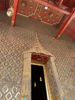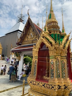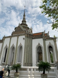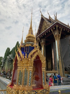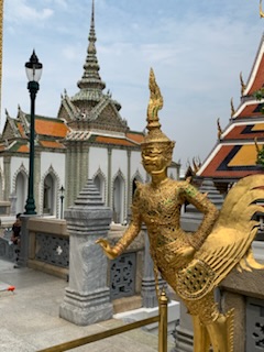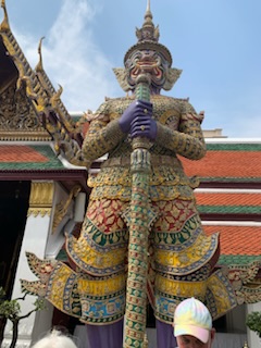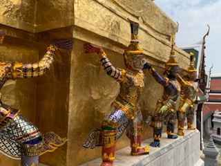 The Grand Palace complex was established in 1782 to serve not only as the residence of the king Rama I, but also as the area for administrative office: Throne Room and other structures. The two earliest buildings were the Dusit Maha Prasat Throne Hall and the Hor Phra Maha Monthian Dharma (the auxiliary library built by the prince – younger brother of King Rama I) to house Buddhist scriptures. Entering the complex, (at least the part open to the public as it is still used for ceremonial occasions, even though the King now lives in another palace), we were amazed at the entire place with the camera clicking everywhere as rounding each corner things seemed to be more magical that the prior corner. The first sector was the great lawn, but one could see in the distance many buildings and gold seemed to be everywhere. Entering the section where many of the “religious” buildings are located, the first thing one sees is the gallery with the roof held up by columns on one side and a solid wall on the other which has many images of the story of Ramakien. The story is that Tosakanth (the king of demons) kidnaps King Rama I wife – Sida. Tasakanath asks his numerous relatives to help him beat the king who has come to fight with an army of monkeys to get his wife back. He succeeds and returns her to his capital. Thus many stupa’s and other structures have demons and monkeys apparently holding up the structure. There are many buildings, Stupa’s and temples in this complex.