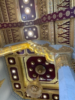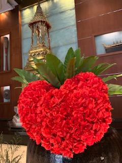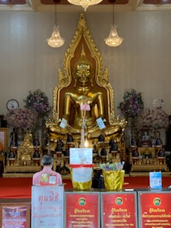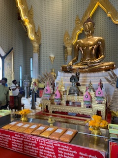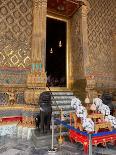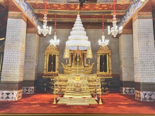 Our first stop was in Chinatown on Charlene Krung Road, Samphanthawong District, Bangkok 10100 at Traimit Witthayaram Temple or “Temple of the Golden Buddha” (Sukhothai Traimit). It is the largest Golden Buddha in the world and appears in the “Mara Conquering Attitude” which is the typical style when Sukhothai was the capital of the country. It is made of pure gold and measures 12 feet 5 inches in diameter and 15 Feet 9 inches from the base to the crown. It weighs 5 1/2 tons and is some 700 years old. This image has been displayed in various temples most recently in the Choti-Nara Temple or Wat Phrayakrai in the Yannawa District. This temple was deserted and the Buddha image was covered in plaster many years before to prevent warring factions from ceiling the gold. When destruction of the temple was to be undertaken for giving way to more modern construction purposes, it was moved in 1931 to a building in the Traimit Witthayaram, a compound of it’s current location. A new shrine was built in 1955 and when the Buddha image was moved a piece of the plaster covering the image broke off and it was only then that it was discovered to be made of pure gold. We entered the basement, removed our shoes and took the lift up to the base of the entrance to the shrine. After dropping our shoes (you cannot enter the holy area with shoes on or even carrying them). We climbed the few steps and entered the holy place. There are 4 entrances, one on each side of the square pedestal, giving way to the high (estimated at 30 feet) ceiling with a raised platform (some 15 feet high), on top of which sat the spectacular golden Buddha. In front of the Buddha was an altar with offerings and two, 2 foot high intricately woven reeds forming a king cobra image. Often the Buddha images are shown with a king cobra forming a parasol-like image protecting it. Snake iconography represents the soul going from the land into the heavens. After admiring the room, doors, image and other items in the room, we descended the 90 steps and briefly saw a “Secondary” temple with a Buddha statue and other buildings, before heading back to the van and continuing our journey through China town and the flower market to the next and principal stop of the tour – The palace of the king.