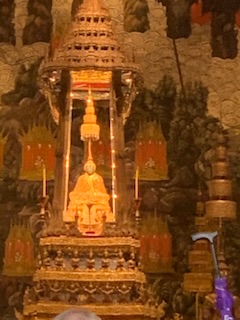 Perhaps though, the most “Holy of Holy’s” is the Temple of the Emerald Buddha (actually carved of Jade, not emeralds, but is green), built by King Rama I in 1782. It is 66 centimeters high and 48.3 centimeters wide at its widest point. This image is considered the most important one in all of Thailand. It is dressed in different clothing depending on the season. There are three seasons in Thailand: the winter (now as it is only about 32C / 90F), the rainy season and the summer. At the change of season, Buddha’s clothes are changed, and it is only the King who can change the clothing in a special ceremony. The origin of the jade statue was that it was discovered in 1466 in Chang Rai, a province in the north of Thailand. In the reign of King Tilokaraj (1441-1487) it was taken to Chang Mai in 1481. In 1552 King Chaichetta, of Laos took it to Luang Phrbang in Laos. When Vientiane City became the capital of Laos it was moved there in 1564 where it remained in “The Temple of Dawn” until 1778 when King Rama I took it to the Siam capital Thonburi. On March 5, 1784 it was transferred to the existing location.