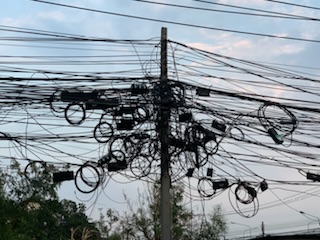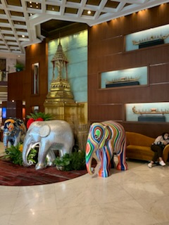 Our next stop was lunch at the Royal Orchid Sheraton hotel, passing the “Buddha Selling Street” where shop after shop sold Buddha images / sculptures of all sizes and types. Of note also was the “spaghetti” of electrical, internet and telephone wires at each post, seemingly haphazardly places on poles. Some hanging down to strangle an unobservant passer-by! A scene reminiscent of Buenos Aires, Argentina and many other cities. Lunch was inside the restaurant with a lavish buffet of Thai and other food, which we greatly enjoyed.