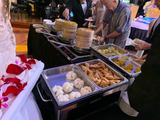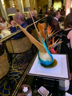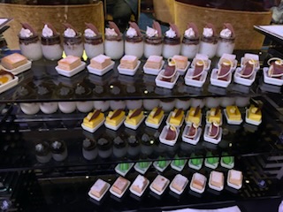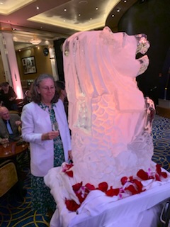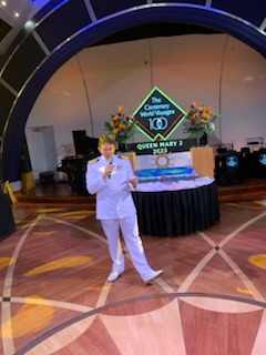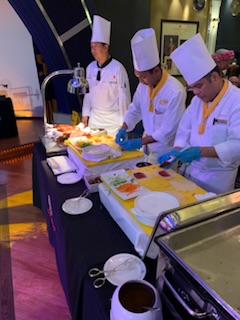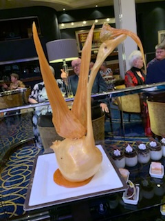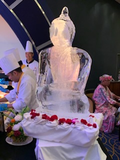 The evening saw another party by the captain and senior officers for all of us on the World Cruise. This time back in the Queens Ballroom with a beautifully carved Buddha and Merlion (Singapore) and spectacular food – dumplings, duck crepes and more. We had a nice chat with a couple of the dancers from the Cunard Singers and Dancers, which was fun. The show was a very talented Australian violinist Suzie G. Who came out in a white sequin dress and a white violin.