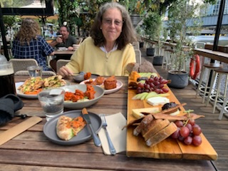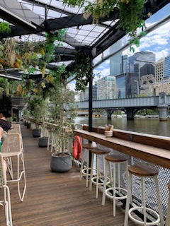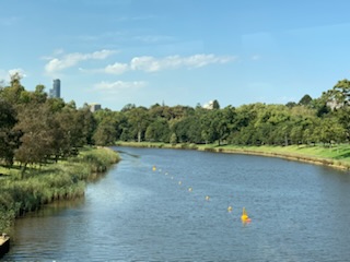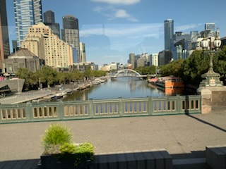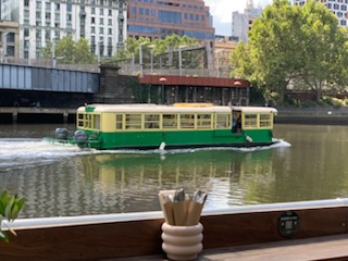 We advised the guide that we would be staying in town and finding our way back to the ship on our own using the shuttle bus. We asked if he recommended any restaurant and he sent us across the Yarro river to an Italian restaurant – Brunetti. When we got there it was a sandwich type place with an extensive bakery, but not what we were looking for. So we retraced our steps, walked back across a different pedestrian bridge across the Yarro to a place we had seen along the river. We enjoyed a terrific Tapas type lunch with cheese board, halloumi cheese, spicy chicken wings and flatbread with pesto and chile sauces at Yarra Botanical, Southbank Promenade, Southbank VIC 3306 as we watched the 8 person skull and water taxis that resembled trams going up and down the river.