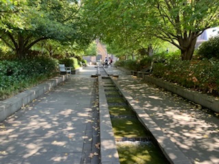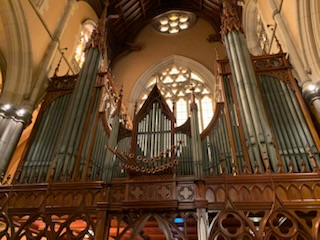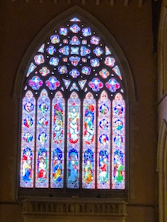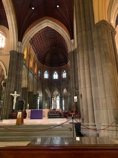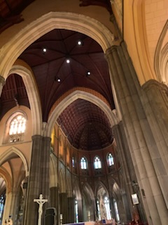 We then were given free time to roam the gardens, but we passed. Near the gardens was the Roman Catholic Cathedral of St. Patrick’s, so Anne and I walked up the hill and visited the spectacular cathedral with its dark stone facade and gardens. A stepped waterfall ran the length of the entrance access path and two statues, one to St. Francis of Assisi (1181-1226) and the other of St. Catherine of Siena (347-1380) stood on either side of the gardens as one entered the side of the Cathedral. A beautiful worship space with a major organ and even an image of Our Lady of Guadalupe was by the main altar.