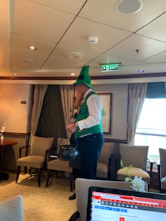 After a good lunch we headed to the Shuttle bus to take the 40 minute ride back to the ship. Unfortunately 2 shuttle bus coaches were “lost” so there was a substantial queue even though it was 2 hours before the last shuttle. We eventually got onto the third coach to arrive and the queue at that time went to the end of the block and 3/4 of the way down the side street. So we were lucky to get back to the ship. After dinner with another Guinness, we attended the show “Boys in the Band” a young 3-man group performing songs of the “Boy Bands” (including the Beetles) of the past. We then went to the Queen’s Room where a male Irish duo “Two Sheets to the Wind” was performing Irish songs, which we enjoyed for their first set which was about an hour.