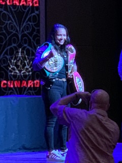 The day at sea started with Church, done by the new Deputy Captain, who we had not met before as he just boarded, followed by lectures. However, the first was an interview of the female world champion boxer – Louisa “Lulu Bang Bang” Hawton, by the entertainment director Neil Kelly. He is very good, putting the person at ease and chatting about their lives. Certainly a fascinating woman who says she is “retired” from boxing, managing her son’s boxing development, but would love to fight one particular lady if the conditions were right.