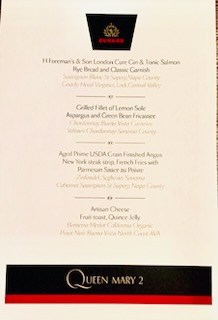 We have come to enjoy the Lunch & Learn this time – California Napa & Sonoma Valley wines, paired with food in the Verandah. The sommeliers gives a talk about the vineyards, the conditions and discuss the merits of the wine being tasted. As usual there were 8 wines it is the equivalent of one bottle of wine per person (at 100 ml this represents 1+ bottles of [750 ml] wine bottle). Today however, Anne just tasted each of the wines and passed me the glass to finish, so I figure I “had to” drink the equivalent of 2 full bottles of wine (average 14% alcohol) over lunch!! Here is the menu:-