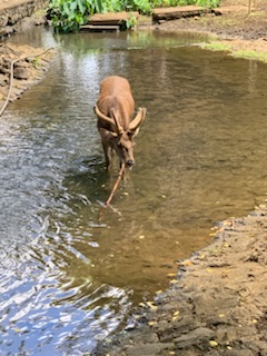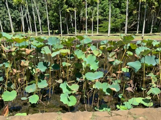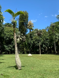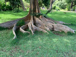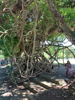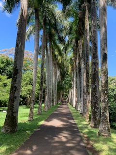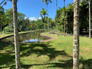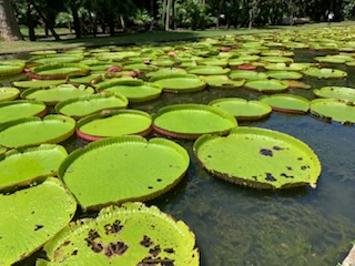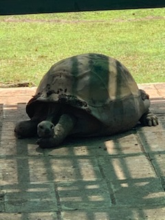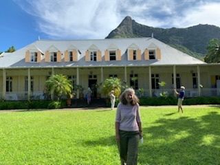 We then continued our drive through the city past the parliament with statue of Queen Victoria, the Bank of Reunion which is the tallest building on the island and past many other buildings, through Chinatown and out of the central part of the city. We headed to the SSR (after the PM Sir Seewoosagur Ramgoolam) Botanic Garden Pamplemousses. It’s origins date to 1736 when there was experimentation as to what plants would grow in the region. In 1767 Pierre Poivre, purchased the property who initially focused on spices such as nutmeg and cloves. By 1785 it consisted of 600 plant species. It was then known as the King’s garden and It was here that the guide really came into his own and shined. He talked about each of the trees, the different palms – walking palm with roots coming out as if legs, the elephant palm, the millionaire palm that is eaten etc as well as all the other trees. In one area there were some animals – giant Tortoises, Deer and others. Perhaps the most impressive part was the floating Giant Water Lilly (Victoria Amazonia) pond. It was introduced into this garden in 1927 and was “discovered” in 1801 by the German Botanist Thaddeus Haeckel and named in honor of Queen Victoria. We saw these a couple of years ago deep in the Amazon Jungle in Manaus (3 days by ship along the Amazon from the Atlantic Ocean). They are truly amazing and consist of a flat leaves floating on the surface with vertical rims that can get to 20+ centimeters high all around the edge of the circular plant. They can reach a diameter of 3 meters (9-10 feet). The night blooming flowers are initially white turning to violet the next day. On the third day the flower sinks to develop a seed capsule that can contain up to 300 seeds. They develop spines on the bottom to protect against predators. This pond is about 100 meters (yards) long and 30 meters (yards) wide and covered the full length with these amazing aquatic plants. The optimal temperature is between 25C and 32C for growth. We really enjoyed the Gardens, and managed to see quite a lot of the park.
