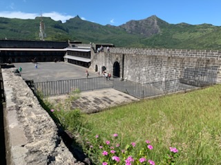 Back on the coach we drove to another part of town where we were dropped at the door of Fort Adelaide / Citadel, again with no explanation, but after climbing the ramparts, we got a spectacular view of the city and the horse racing track. According to some of the signs, it was built between 1834 and 1840 on the “Petit Montagne” facing the Port Louis Bay. Part of the structure, built by the French in 1743 was incorporated into the Fort. It was named after Queen Adelaide (wife of King William VI). It measures 150 X 100 meters and can accommodate 200 soldiers with a stock of food lasting 3 months, 40,000 gallons of water and 280 barrels of gunpowder.