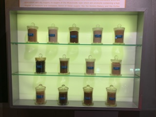 Our next stop was the “Sugar Adventure”. This is an old sugar mill, now converted into a museum but all the old equipment has been left. It not only talks about the era when sugar was the dominant crop, and still today there are sugar mills and sugar is an export, but it also is a history of the island. Unfortunately we were a bit rushed through it, but posters explaining the island and the different crops, eras etc were well laid out. After the tour of the museum / factory, we went through a “sugar tasting” (like wine tasting) with 8 different, unrefined sugars and what each is used for. One thinks only of refined, white sugar or light / dark brown sugar, but there are many different shades and different tastes. We learned a lot from this. Next to the other product from sugar cane – rum. They make a variety of different rums and we tasted half a dozen, very interesting the differences between them. One final point before moving on was an explanation of the flag of Mauritius – 4 parallel horizontal stripes each the same width: red at the top followed by blue then yellow and green at the bottom. They represent red – the blood of those who fought for the island; blue for the oceans that surround it; yellow for the beaches that are all around the island and finally green for all the forests and green areas that make up the island.