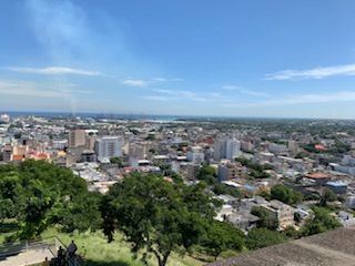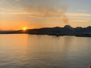 We docked early this morning starboard to dock as we did a 180 turn just outside the harbor then backed up for 1/2 hour in a narrow passage that is the harbor, past various container and other cargo ships until we slid in just behind another commercial vessel but only some 10 feet away. Great maneuvering by the captain. The dock is commercial and there are absolutely no facilities of any kind. A couple of tents were put up to shade the authorities, but no vendors or buildings. We walked over the quay to small 15 passenger coaches and boarded, left hand drive, with a young man, Gregory as our guide. He admitted at the end that we were his very first group coming off a ship that he had guided as he is still in school. Although he was not very good as we travelled around and telling us when to be back on the coach etc, he was brilliant at the Botanical Gardens which was our third stop. The first and second were a colonial home and a fort, and after the garden we went to a sugar factory, a shopping mall and a red church.