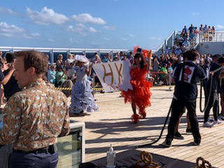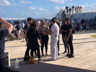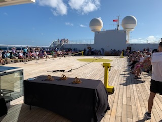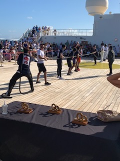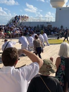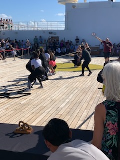 The other big excitement was the tug of war between different groups of workers on the ship. It had been 3 years since they did this and they only do it on a world trip, with the ladies, the men and mixed teams all competing for the “Golden Knot”. This is a trophy made of rope, painted in gold and carefully arranged in a curl on a wooden base. This is given to the winning team in each category. First the ladies, 6 on each team competed and as there were 4 teams the two who lost were eliminated. Next the mixed, 3 men and 3 women on each team. One team won easily but the crowd complained as one team had 4 men and 2 women, so it had to be repeated. Once they were down to 2 teams, it was the turn of the men. Each department: Housekeeping, Tours, Mechanical, Entertainment, Deck hands, Mechanical etc put up a team and went through the elimination rounds. It was then down to the three finals. For those not familiar with the game – a long piece of rope is placed on the deck. A hanging piece of duct tape is hung around the center of the rope hanging some 1-14 inches down from the rope. Then three pieces of duct tape are placed on the deck as marks, one in the center of the “court” (flat deck area with sides marked off with yellow tape) and the other two some 10 feet to either side of the central mark. The objective is for each team to pull the rope so that the center duct tape hanging from the rope passes the outside mark on the deck on their side. There was one unfortunate incident where one of the players collapsed and had to be attended to by the medical staff, who had formed one of the teams so all were present on deck. He eventually got up and walked off under his own steam. The results were – Ladies: Cunard Singers; Mixed: Spa team; and Men: Maintenance Department (all very large burly men). Captain Andrew Hall awarded the trophies and a terrific time was had by all.