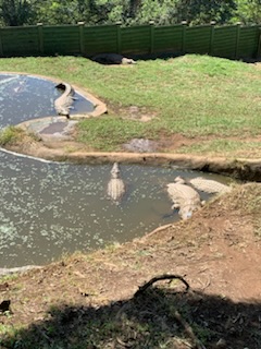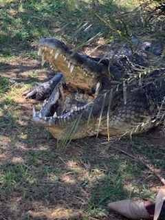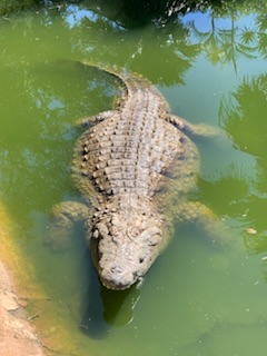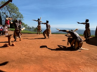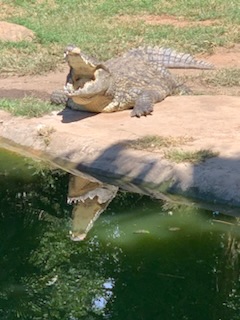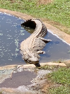 We docked in the commercial port, the largest in South Africa and according to the guide, the largest in all of Africa. The ship docked starboard to dock, however both sides had a view of the town. We gathered in the Theatre for the tours as each person had to go one by one through South African immigration, just outside the theatre, with landing card and passport. Once that formality was completed, we proceeded ashore. What we found was a tight passage between the ship and the buildings, where one coach at a time had to back up to collect the passengers for that coach trip, then drive off so the next coach could pick up the passengers for the next tour. We were on coach 8, and it is left hand drive, due to the British influence, for the tour of 1,000 Hills. There was an excellent Cunard representative, Veronica, who had been with us on another tour in Australia and the worst tour guide one could hope to have – Irene. She did not know how to use the microphone, despite being shown by Veronica. She never explained anything about South Africa, Durban or anything, but in her thick German accent would say – that’s a tree, those are cars, that’s a building I have no idea what type, these colonial buildings of Post Office and City hall have no use, those statues are of people who I don’t know and nobody cares about etc. Incompetent and negative about everything. At first, people complained that they could not hear and finally resigned themselves to tuning her out, as she was not saying anything of interest or importance, and just enjoying the scenery and what the tour had to offer. At the end, usually the people on the coach clap, by way of appreciation, and many give a tip to the guide and sometimes the driver. In this case when we got back to the ship, no-one clapped and no-one gave her a tip and indeed most did not even bother to say good bye. All this being said and despite that inconvenience, we thoroughly enjoyed the tour and it was a highlight of the entire trip. The reason being that we wended our way up into the hills, past various wealthy and poor areas and the views were very nice. When we finally arrived at the 1,000 hills, we found a Zulu village – pheZulu Safari Park. It is a tourist attraction / private enterprise however, it seems that a Zulu family does actually live there. It is a typical Zulu village with various thatched huts located on the top of a hill, 1,000 meters (3K+ feet) above sea level, with a beautiful view over the valley of many hills and peaks. We did not try and count the 1000 peaks!! We were ushered into an amphitheater / shell structured building made of wooden poles and thatching, overlooking the 1,000 hills. After being seated we were treated to an excellent series of Zulu dances telling the story of man, wooing a female into marriage. The Zulu practice polygamy and a man can have as many wives and he wants and can afford. In the exchange a man must give a minimum of 11 cows to the family of the bride in exchange for their daughter marrying the man. Another condition is that the first wife must accept the other wives, and third, the man must treat them all the same and “put up” with all the mother-in-laws and their family!! The dances showed off the agility and almost frightening warrior spirit that the Zulu’s are famous for, while at the same time showing the wooing of the woman. In South Africa which has a population of about 56 million, the Zulus number about 10 million. The dancing lasted about half an hour and the five young women (who all wore sneakers) and 5 young men (barefoot) as well as the drummer and older “Mother / fortune teller / witch doctor / herbalist” were happy to interact with us and have pictures taken with them at the conclusion of the dancing. We then enjoyed a special cake with cream and jam and coffee or tea in an area with tables, again with a spectacular view of the valley of 1000 peaks. The excitement continued as we were then taken in groups to visit the live animal park. Here we were up close and personal with a series of some 25-30 large alligators and 50 odd baby alligators as well as some 30 snakes, some are highly toxic like the black mamba, spitting cobra etc as well as the snakes that squeeze you to death. The leader of the group, offered to put a snake around the neck of anyone who wanted, we declined!! There were also turtles and tortoises and other animals. A great introduction to African animals that in the bush are the ones that share the land with humans. The entire 2 hour experience was really fabulous and we greatly enjoyed the tour.