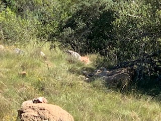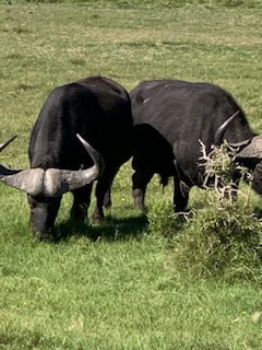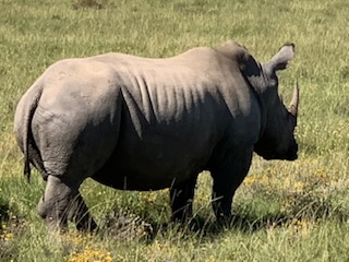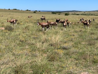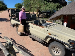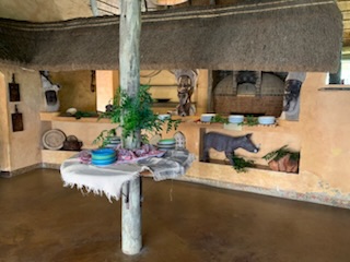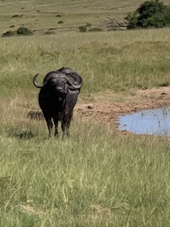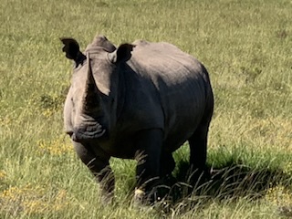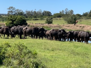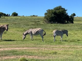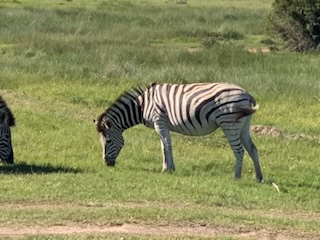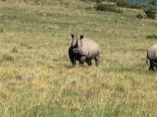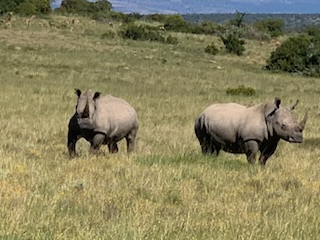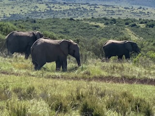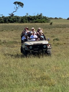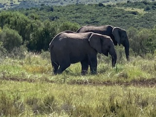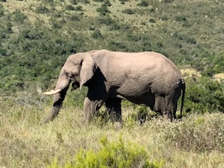 We boarded the luxurious coach and a young vivacious married girl – Lidelia was our very good guide and Conrad the Driver. She told us she was married as her dowry consisted of 20 cows. When she got married 3 years ago each cow cost RND 2K-3K each whereas now they are RND10K-15K (FX 1 US# = RND18.50). As we passed through the town she explained that there was a viewing tower, that this province of eastern Cape is the poorest in South Africa, but she claimed the most beautiful with extensive beaches and natural countryside. We passed Townships (Black African suburbs) as well as more affluent suburbs. There is an issue with electricity so there is a rolling 6 hours on and 2 hours without electricity each day. As we drove through town all the traffic lights were off as there was no electricity at that time, but there was when we returned. We did see a couple of windmills for electric production. An impressive stadium – The Nelson Mandela stadium is a 44,000 seat football stadium built for the 2010 FIFA World Cup. We passed the Addo Elephant National Park near Colchester which was established in 1931 and is the home of “The Big Seven” – Some 900 Elephants, Buffalo, Leopard, Rhinoceros, Lions (these being the classic “big 5”), plus Sharks and Whales in the marine area This together with birds, eland, hyena, kudu, zebra, hart best, antelope and others make it a big tourist destination. There are a lot of other Game Parks in the area such as – Amakhala, Barefoot Addo Elephant, Baviaanskloof, Bellevue, Daniell Cheetah, Groendal, Kriega, Kragga Kama, Kuzuko, Kwantu, Pemba, Schotia, Shamwari and the one we went to Lalibela (off Route N2 after Bushman’s River – Phone +27(0) 41-581-8170OR +27(0) 71-852-1009 (WhatsApp) – www.lalibela.net). We arrived and after completing the necessary waivers (“if an animal eats you it’s not our fault” type of paper) to see thatched roofed buildings, very well kept, and were led down a relatively steep stone pathway to a seating / bar area overlooking the property then up a rather rickety wooden slatted raised walkway to a “Round House” also thatched with the roof inclined to the center. The central 12 foot circle was open and graded towards a central drain. This was divided into an area with tables for eating a kitchen / serving area. A salad bar and a raised area that had a bar, and rest room facilities. A complete restaurant. After a few minutes we were directed to enter the open Range Rover vehicles that had three rows of three seats abreast and the driver and one passenger in the front. So 11 people in total. We climbed into the middle seats and soon the driver guide introduced himself, gave us a few rules: Never stand up; Never get out of the vehicle; All phones must be off as the ringing could cause the animals to charge etc. Animals in the wild see a large vehicle as another large animal, but if you are walking they see a smaller person and can more easily attack. Excitement heightened and we were off on our first adventure into the wild. We first went towards a water hole where there were a lot of aquatic birds, ducks and four Hippopotamus, that were almost completely submerged, with just the snout and eyes visible above the water. They apparently get “sunburned” so spend a lot of the day in the water. The guide indicated that they are the one animal that causes more deaths to humans than any other animal in Africa, so keep them at a good distance as they can run fast and with their weight, cause a great deal of damage to humans. On the ridge there were several ostriches and we could make out a few Zebras in the distance. The driver / guide would follow the same pattern at each stop. He would get as close as he felt was safe, turn off the engine, explain what we were seeing, tell us about the animals and give us plenty of time to take pictures. When all were finished with the pictures, he would then drive to the next area where there were animals we had not seen. Although there were some gravel paths criss crossing the land, which he would use at times, he felt just as comfortable going across land to get close to animals. Again if we had seen a lot of a particular animal, he would just drive past them or wait until they were off the trail. We were definitely in the animal’s territory, not in a place where humans rule! Certainly tele-photo lenses, binoculars, zoom lenses helped, but a simple phone camera certainly permitted you to get photos to remember.