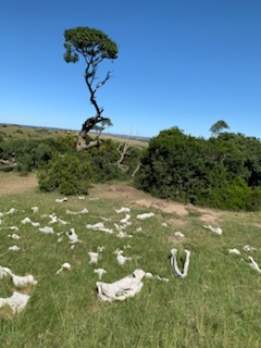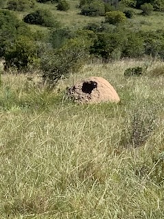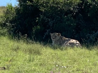 We climbed a hill and stopped to admire some zebras, some of probably 200 that we saw on the travels around the reserve. Some warthogs / wilder beasts approached and the zebra moved on. Virtually all the animals we saw are herbivores, they all eat the grass and shrubs, the exception being the lions. At another water hole we saw some 50 Water Buffalo with major sets of horns, a head that is stronger than concrete and even one baby that had been born yesterday with the mother’s umbilical cord still hanging. The speaker on the ship had told us that when you go onto a game reserve, always look at the babies. If they are healthy looking, the reserve is doing things right. All the babies we saw were doing well and looked very healthy. All over the property we saw impala, eland, ibex and deer type animals, several hundred of these. We ran across a hundred or more ant hills, some that were 3 foot high. Some had a hole in the top where the nocturnal feeding Aardvark (ant eaters) had “dined” last night. Over the hill there were mode Ostriches: black the males, and brown the smaller females. However, the next of the “big five” we saw were two White Rhinoceros initially resting on the ground, but then got up as we approached. Whether it was just one of those things or whether there was a pattern, we are not sure, but most of the time one faced one way and the other in the opposite direction either side by side or rear to rear, looking out for possible predators. Their “armor plated type skin” is so thick that it is difficult for a predator to bring them down, however soon after seeing them we turned a corner and under a tree, by he bushes were a set of bones, picked completely clean of what appeared to be a Rhinoceros. Here we really got the full understanding that we were in the wild and their territory. They are not fed or taken care of by the game keepers, it is “Nature Rules”, Darwinism at it’s raw state. Another of the “big five” we saw was first a male lion, resting under a bush out of the hot sun, as they hunt at night. The take a big chunk of meat and swallow it so the digestion process takes some time as they don’t have to eat again for a week. This lion was quite happy for us to observe him and rest in the shade. In another area of the park there was a female lion who at least raised her head to see what this strange thing (us) was doing near her, but she also was quite happy to rest in the shade. We were told that they keep the lion population to a handful, they currently have 8 as if there are too many, being meat eaters, they can kill off some of the other animals creating an imbalance. The guides all communicate with each other as two other similar vehicles were driving over the reserve with other guests from the ship telling each other where the animals were located. At one point our guide said, ok let’s go an see if we can find an elephant, I saw them over here earlier today. Just at that point another vehicle came in saying the elephants are … in a totally different quadrant. So we drove for some 15 minutes past a lot of other animals and eventually caught up with initially two elephants who ambled along while we drove beside them. After which the driver decided to go over a hill and there we found another 10 elephants and a couple of babies. So very exciting.