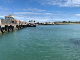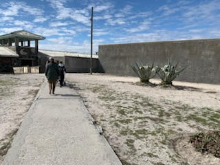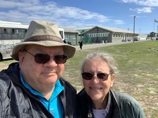 Once back on the coach we retraced our steps back to the prison, first going through the “town”. When this was a prison there were guards and officers who lived on the island and a small town, with clinic, school, church etc was built. Today there are some 100-150 people living on the island, all working for the “Museum” / UNESCO Heritage Site that is the Island. They have desalinated water, electricity from solar panels and internet. To keep up the school they need to have 15 students (total at all levels), but currently only have 11, so they have to take one of the three ferries to the mainland each day to school. During COVID, or bad weather, they were able to take classes on-line. The small white church with a plaque “Erected in the Year of Our Lord 1841 – Captain Richard Wolfe Commandant of the Island” appears just above the door. Every February 14th couples are allowed to get married in the church or renew their vows. As Craig said – “not for me” – marriage and prison don’t go well together. Another custom is that whenever there is a child born on the island to one of the families a pink or blue flag is flown from the church steeple. The island has not always been used as a prison. It was a “lunatic asylum”, a “leper colony” and a “military fortress” as it lays at the entrance to the harbor. Thus, there are vestiges of the small criminal prison, the barracks, the male and female & children leper houses etc. One of the stops was at the cemetery of the leper colony, which had a number of gravestones, although the numbers were probably much more than that.