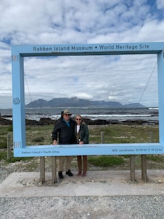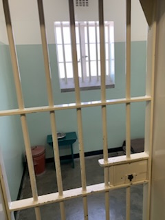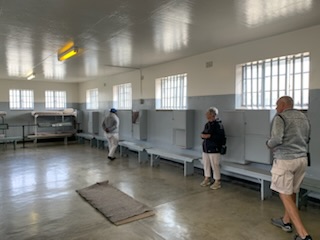 Today started early as we were to meet our tour on shore by 7:30AM. We were off to Robben Island. The name in Afrikaans is Robbeneiland and is 4.3 miles (6.9 kilometers) off the coast. It comes from the Dutch Robben – Seal, thus the “Island of the Seals”. We boarded the coach, which was very cramped as there were three seats on one side and two on the other (as opposed to the usual 2 and 2) with a center aisle that was 12 inches wide at most and the seats were smaller than usual. Two tour guides came on: Laverne and Molly; addressing the 63 passengers, calling names one by one. As hands were raised, Molly made her way, with difficulty up and down this very narrow aisle giving each name a unique, named paper with QR Code that was the entry ticket to the Ferry and Robben Island. After all had received their tickets and the group divided into two, half with Laverne and the rest with Molly, the coach drove off driving 10 minutes away (it was only a 5 minute walk) to the Victoria and Albert (V & A) Harbor-front. This is a very nice area along the bay with many shops, restaurants and upscale flats. We then queued to get onto the ferry to take us the 35-40 minute ride to Robben Island. A catamaran, yet still somewhat of a choppy ride, with excellent TV documentary / explanation of what the island is all about. The big excitement however was that as we boarded the vessel we could see in the bay a large number 20-30 dolphins, jumping out of the water and “putting on quite a show”. A great send off to the Island. For those who come on their own, one can easily walk from the cruise terminal to the Waterfront and get a ticket to go on the ferry to the island, without a tour. The only issue is that once on the island we believe that all you will see is the prison and that occupies a very small part of the island. We boarded Coach 10 together with the local guide Craig. A young “Colored” (not black nor white) man as he called himself. He was absolutely one of the most brilliant, eloquent, moving, erudite guide / speaker we have found anywhere. He immediately stopped the coach a few hundred feet from where we started and without a microphone, set the stage for the visit. He said: I will say many controversial things, but because of the importance of what I have to say, I want you to hear my voice directly not through the speakers. He then laid out the tour which was to consist of two parts: the first, under his guidance was seeing the various parts of the island that was not the prison; and the second, the prison itself, with a different person, the Maximum Security Prison, for political prisoners. The island is oval measuring 2 miles log north to south and 1 1/8 mile wide and covers an area of 2 sq miles (5.2 sq km) and has some 700 buildings. You could hear a pin drop. He spoke from the heart not only telling us about the prison, but more importantly the meaning behind what it has meant to the country. Most tours stop at the various places and end up at the end before returning to the prison itself. He, very wisely as there were 4 coaches, always prefers to go to the end and then work his way back to avoid the stopping and waiting for the others. He spoke of the three things the government focused on in 1948 to make a change: Education, Media and The Mind of a Child. If you control the education so only “Your Side” of reality is told, you control the thoughts of your people. The mind of the child is controlled by the knowledge it is fed by parents, educators and the media. If you control the media to only tell your side of the story, that is what becomes a reality. If you divide a nation into two halves say white and black (like Apartheid) you get the majority (Black) to revolt eventually against the white. However if you differentiate different parts of the population – While, Black and Colored and you reinforce that, like on Robben Island where Blacks on arrival were given shorts, short sleeve shirts and no shoes, while concurrently Coloreds were given long trousers, long sleeve shirts and shoes, you create antagonism between those two groups and not as much against the whites. The old adage – “let you and him fight” comes to mind.
