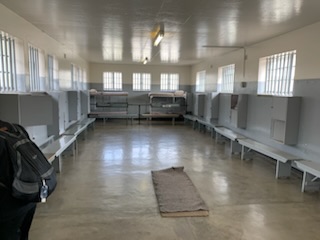 Craig then took us and stopped outside the prison itself. Various buildings / blocks where these political prisoners were held, some in single cells and others, 60 to a cell. We were introduced to the guide and told about his story. The guides going around the prison, were themselves political prisoners that did time on Robben Island. He indicated that this is a “time restricted” experience as the prisoners are dying off so once the last one that can do the tours, dies or is incapacitated, that connection will be all over. In our case the prisoner guide – Delio Ntroel Bngoe from Soweto – introduced himself, he has been doing tours since 2003. Until he was 12 he thought Soweto was the greatest place to live as that was all he knew. However, his grandmother asked him to go into another area to get something. He suddenly saw for the first time what life was like outside the township. This discrepancy in the way people lived drew him to being an activist to try and achieve equality. He was imprisoned as a political prisoner at Robben Island (RI) for 5 years, beaten and treated badly, having to work on stone quarries and when in 1989 after the “day of amnesty” when all RI prisoners were released, he on April 27th 1991 and his cohort, were taken by ferry back to Cape Town and the first thing they wanted to do was to go to the top of Table Mountain and see RI from the top. A scene that the had seen daily from the island. Then they decided they wanted Kentucky Fried Chicken, so they went to the KFC. He was an activist with the youth ANC and got into trouble so had to live in exile in Angola, Botswana, Zambia and Swaziland. He continued his activism from abroad and one day they had been working on the extradition of a couple of people whose cover as activists had been compromised. All was going to plan when they found that one of their number had told the authorities all the details of the plans. They were caught and in 1984 at the age of 21 he and his 4 co-conspirators were tried, found guilty and sentenced to 25 years and sent to RI where he lived in Cell Block F – the first we were to visit. We entered his cell, which was for 60 prisoners, although seldom had more than 40, he closed the bars and closed the metal door. We were there with no way out, just sitting on wooden benches. When he was a prisoner there, they had to sleep on the concrete floor, there were no toilets and a communal bucket was only emptied once a week! It must have stunk! He told us that the prison was built to handle 1,250 prisoners, but at it’s height there were only 900, it was never filled. All prisoners were always referred to only by the number that was allocated to them when they got to the island, so as to further humiliate the prisoners. However, they were able to form 11 football teams and play games against the other prisoner teams. Sunday, they were locked in their cells. There were a few signs around the cell, showing prisoner cards and other documents. One, which was of interest was entitled – Differences between B and C diets –