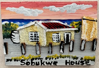 We got to the southern end of the island by the Commissioner’s House / Ladies Rock / Minto Hill, where the Lighthouse is located and were allowed a few minutes off the coach. Apart from rest rooms, there was a small shop, a place to take a picture looking at Cape Town / Table Mountain and in many ways most importantly, a small tent, where prisoners who had spent time on the island and their families can sell whatever they want to help them economically. A few items were there and wanting to help, we did buy a refrigerator magnet of a small yellow house with a saying “Sobukwe House”. We had no idea at the time what that was all about, but if they were selling it, we understood it had to be important. We soon found out why.