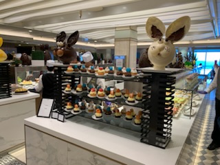 The first Lecture we attended was Gloria Barnett, talking about Ocean World and Marine life. She differentiated the different species of marine life that occur in the Epipelagic Zone 0-200 meters – most of the marine life we know; Mesopelagic 200-1000 meters – area where sperm whales dive, holding it’s breath for 20 minutes each way, to eat ; Bathypelagic 1000 to 4000 meters black the domain of the smokers where there are cracks in the seabed (Pompeii-worm); and the Hadopelagic done 4000 meters to seabed where tube-worms live under very high pressure.The second lecture was Dr. Stephen Payne (who was the Designer of Queen Mary 2) speaking about “Dispelling the Myths of the Titanic – 1912 – 2023”. Many of the myths that run around were actually untrue. In those days, for example the number of lifeboats were dependent on the length of the ship, not the number of passengers; the ship was built not only to the existing standards, but exceeded all the construction standards of the day, etc. We went to lunch in the Kings Court where there was lots of chocolate – animal sculptures, fountains, cakes and sugar everywhere to celebrate Easter. That evening when we got to our cabin after a very special Easter dinner at the Verandah Restaurant, thanks to our Travel Agent’s invitation, we found two chocolate bunnies as our Easter present from the Captain & Cunard, which was a very nice finishing touch.