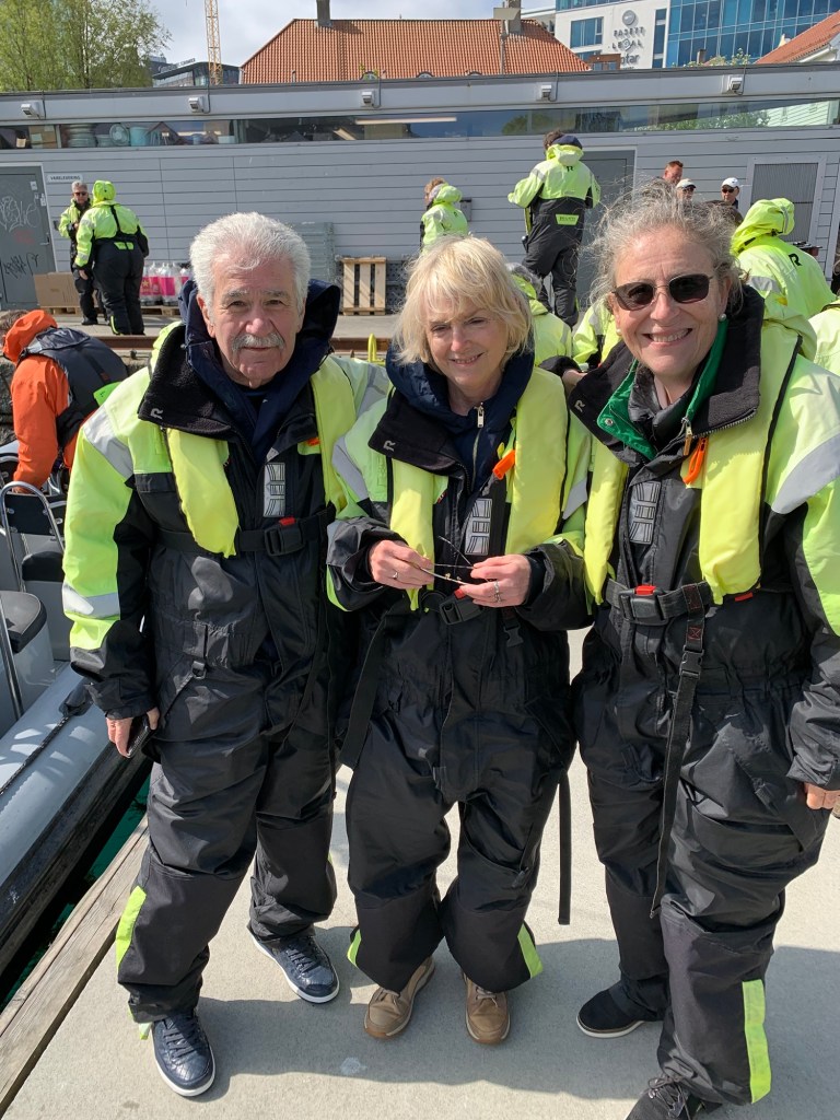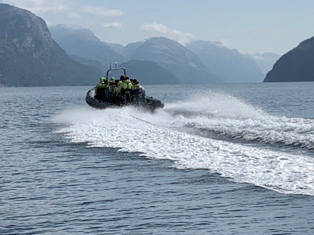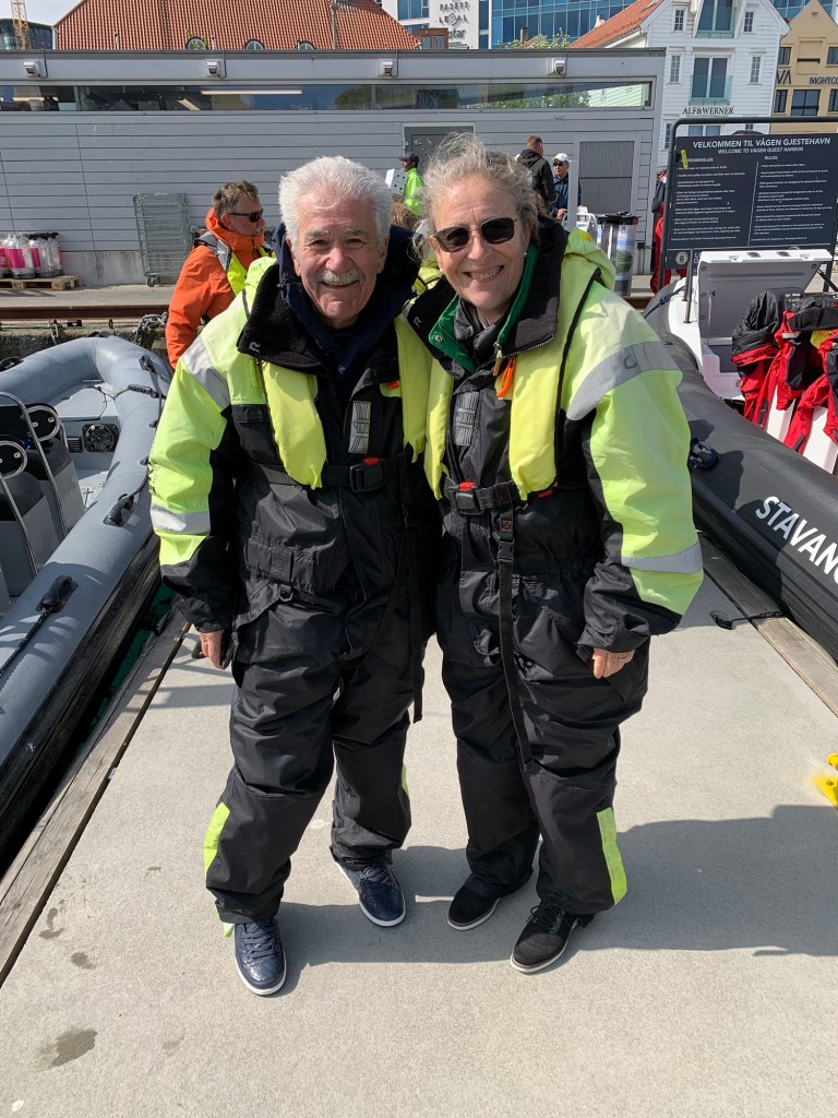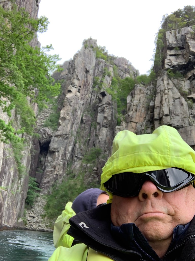 The tour started by boarding the coach, no guide, just a driver that took us on a 20 minute ride into the town of Stavanger, where we were dropped by the Concert Hall and greeted by a tour company operator for our 10 minute walk to the dock. Once there the 24 of us were received by the two skippers of the 2 RIB (Rubber or Rigid Inflatable Boat). We were to put on what appeared to be warm wet suits, but these were insulated and worn over clothes. This was to keep us warm and as they were in fluorescent yellow, easy to see if we were dumped inadvertently overboard. All our carry bags were left in a secure bag on-shore. Once we had also donned the live vest, we were ready to board the RIB. Six in three rows in front of the captain and controls and 6 behind the captain also in three rows. Once in our perches, we put on goggles and gloves and thus attired we were ready for the adventure that was to be – Lysefjord by RIB.