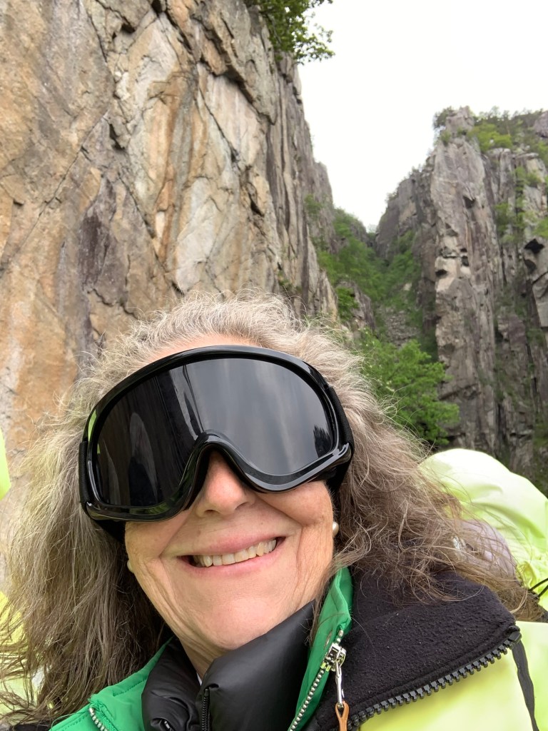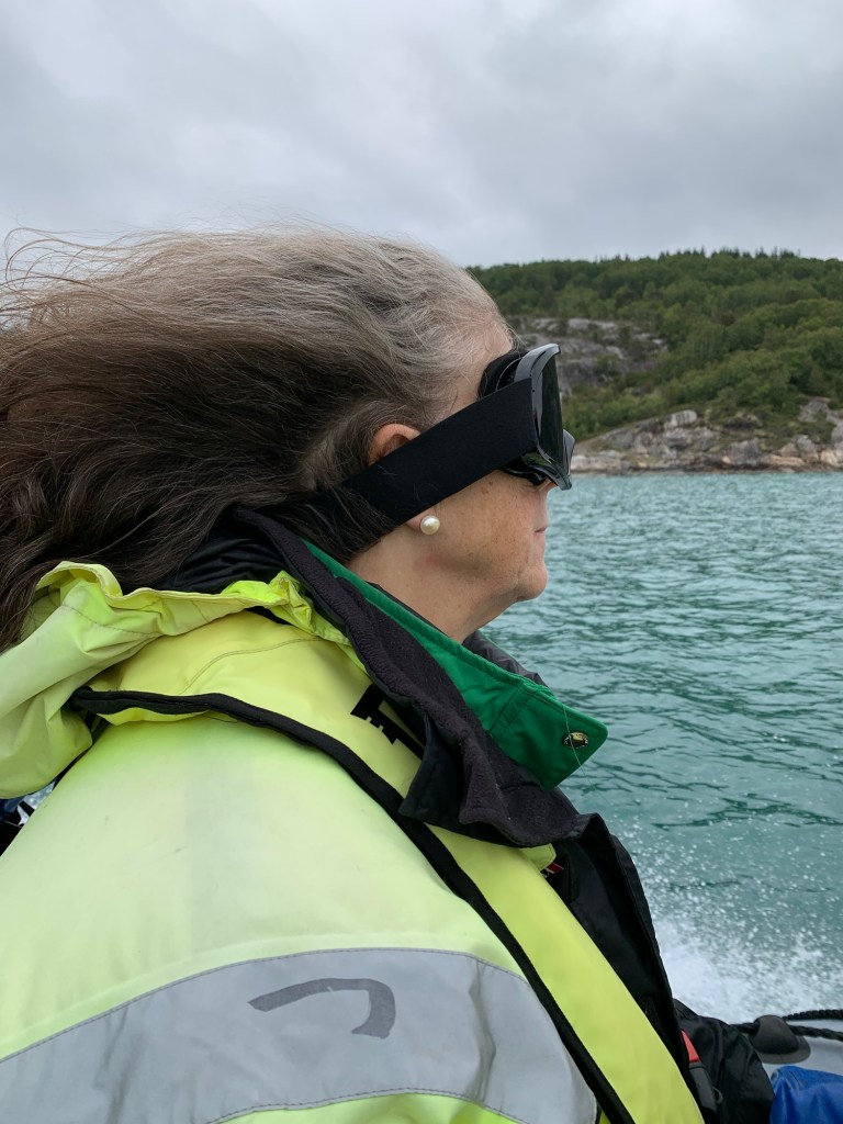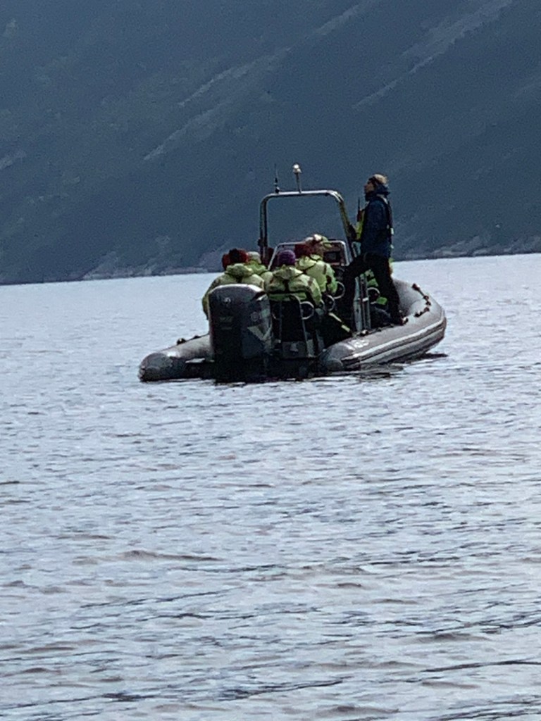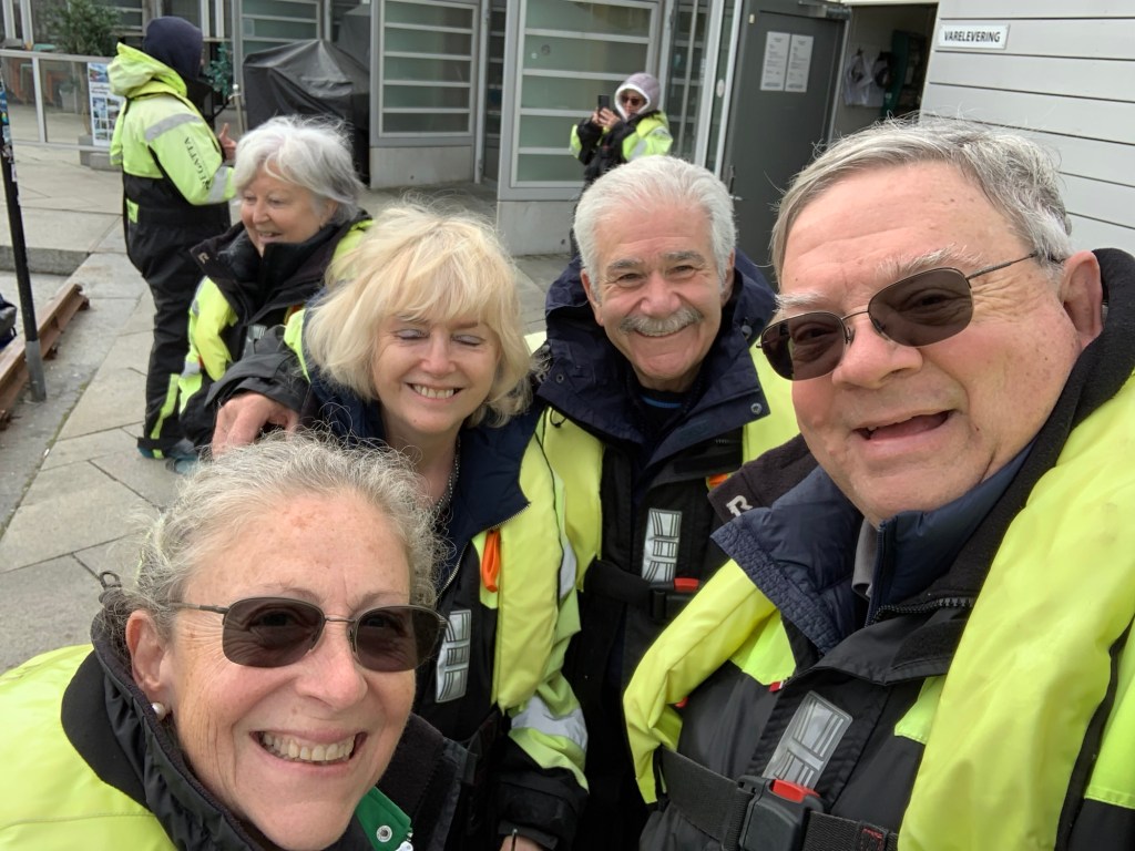 The tour started by boarding the coach, no guide, just a driver that took us on a 20 minute ride into the town of Stavanger, where we were dropped by the Concert Hall and greeted by a tour company operator for our 10 minute walk to the dock. Once there the 24 of us were received by the two skippers of the 2 RIB (Rubber or Rigid Inflatable Boat). We were to put on what appeared to be warm wet suits, but these were insulated and worn over clothes. This was to keep us warm and as they were in fluorescent yellow, easy to see if we were dumped inadvertently overboard. All our carry bags were left in a secure bag on-shore. Once we had also donned the live vest, we were ready to board the RIB. Six in three rows in front of the captain and controls and 6 behind the captain also in three rows. Once in our perches, we put on goggles and gloves and thus attired we were ready for the adventure that was to be – Lysefjord by RIB.