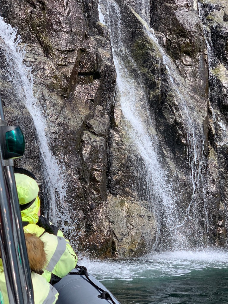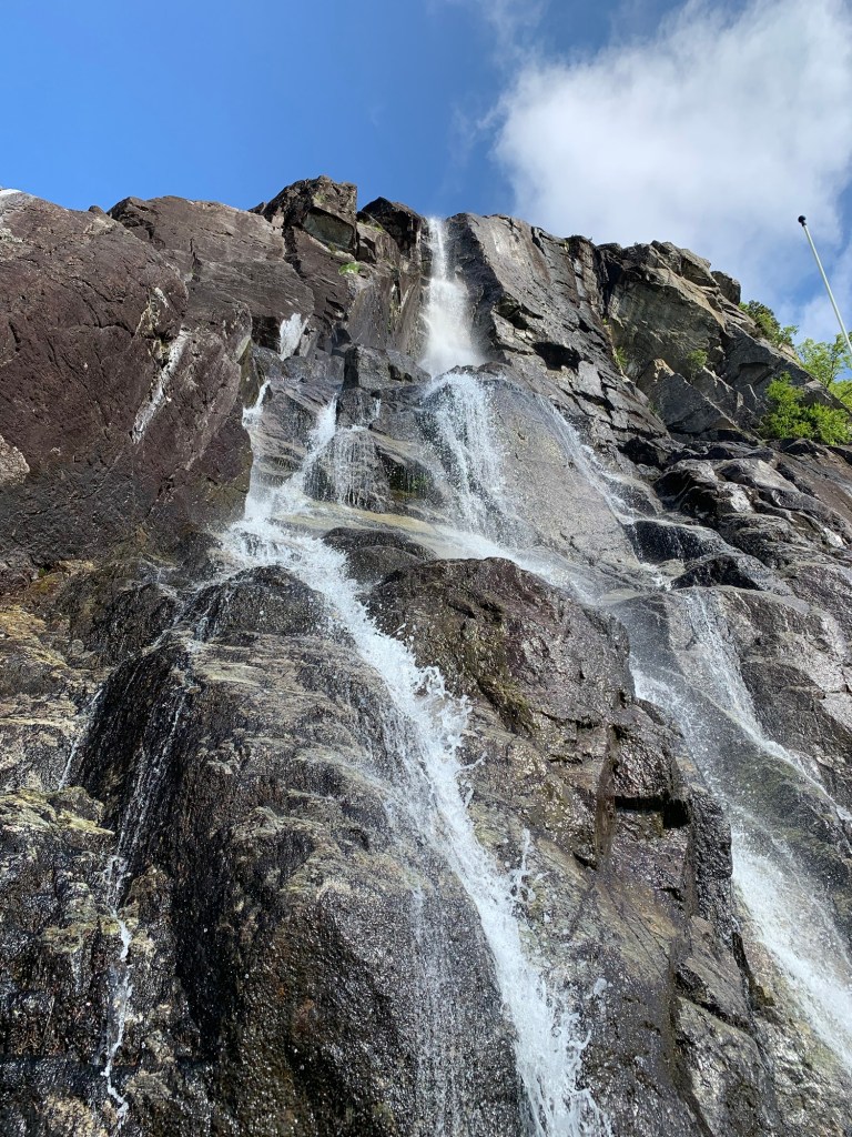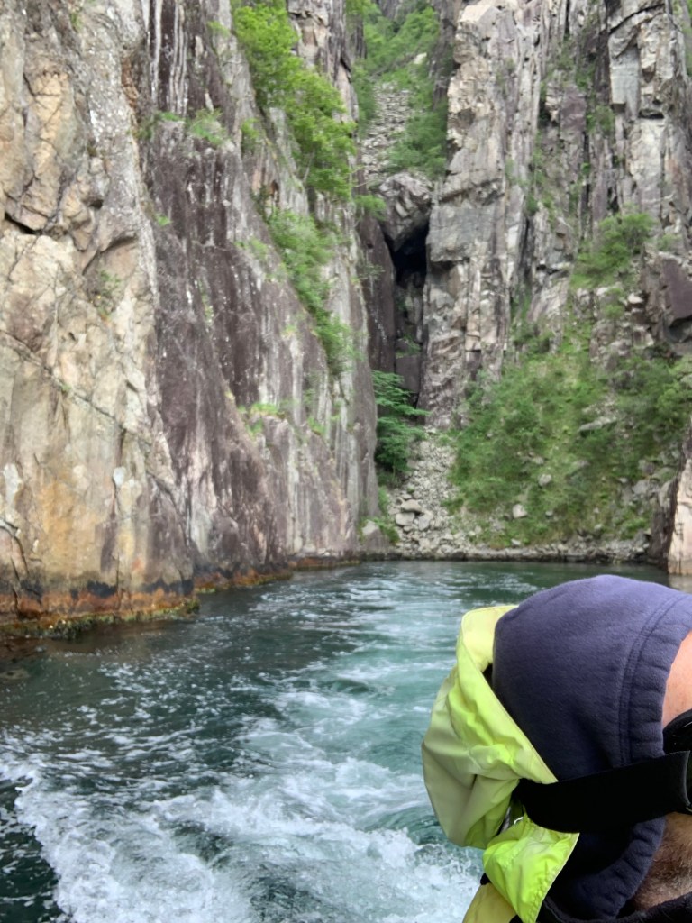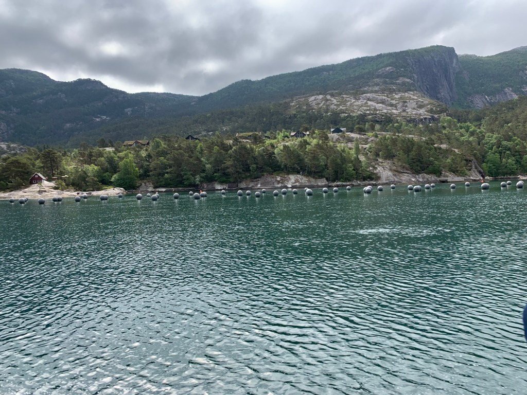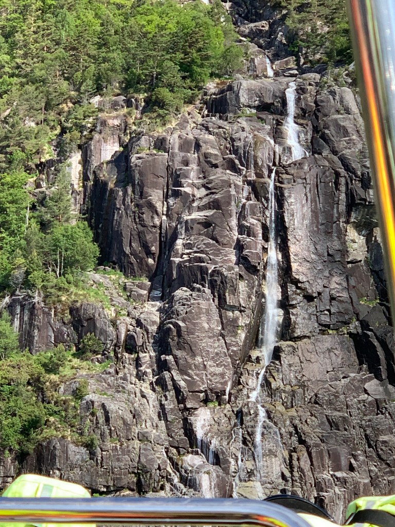 The harbour is charming with typical Norwegian housing, boats of all types and shops / restaurants geared to tourists. As soon as we exited the harbour, the captain said, OK we’re off. With that he turned the 2 large outboard motors to full throttle and we were skimming / bumping over the water at 30-35 knots. Bouncing over the wakes of other vessels and deep cuts left and right bringing the side some 30 degrees off the surface. After some 20 minutes he slowed down and pointed out the salmon farms, large circular structures that have netting above where salmon are grown, in the sea until ready for harvesting. There are many of these all up and down the coast of Norway. We soon sped off, following the cures of the fjord with it’s dramatic views until we reached a very tall set of rock walls some 50 stories high, in an inlet. Here we could make out a cave where a convicted prisoner held out and avoided detection by police. Going close to the side of this rock formation felt like you were a fly on the water, given their rugged and steep formation caused by erosion over the millennia. Our next stop was Pulpit Rock, a formation on the rock-face that resembles a pulpit. One gets a terrific view from the fjord or one can access it after a 4 hour hike only to stand on it and look down at the water. Well worth the view from the water and it is slowly disappearing. We continued on along the side of the rock-face until we got to a beautiful waterfall, called Whiskey Falls by the locals. It is so named as when there was prohibition in Norway a monk living above the falls had a still and would produce whiskey. One day the authorities were about to raid the operation when he got advance word and disposed of all the whiskey down the falls, allowing the fish a wee dram for the night and foiling the authorities! Retracing our steps past still more salmon farms we returned, exhilarated, to the port after an exciting and spectacular 2+ hours.
