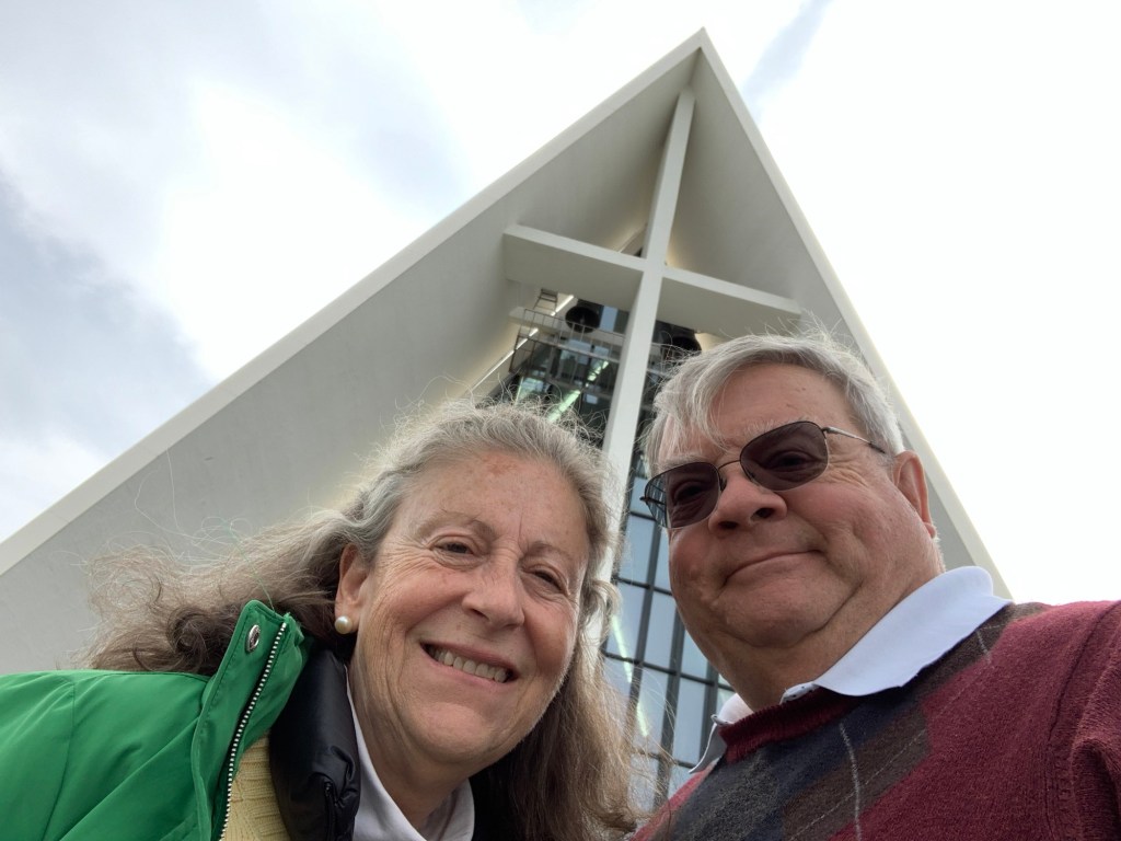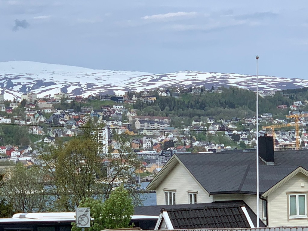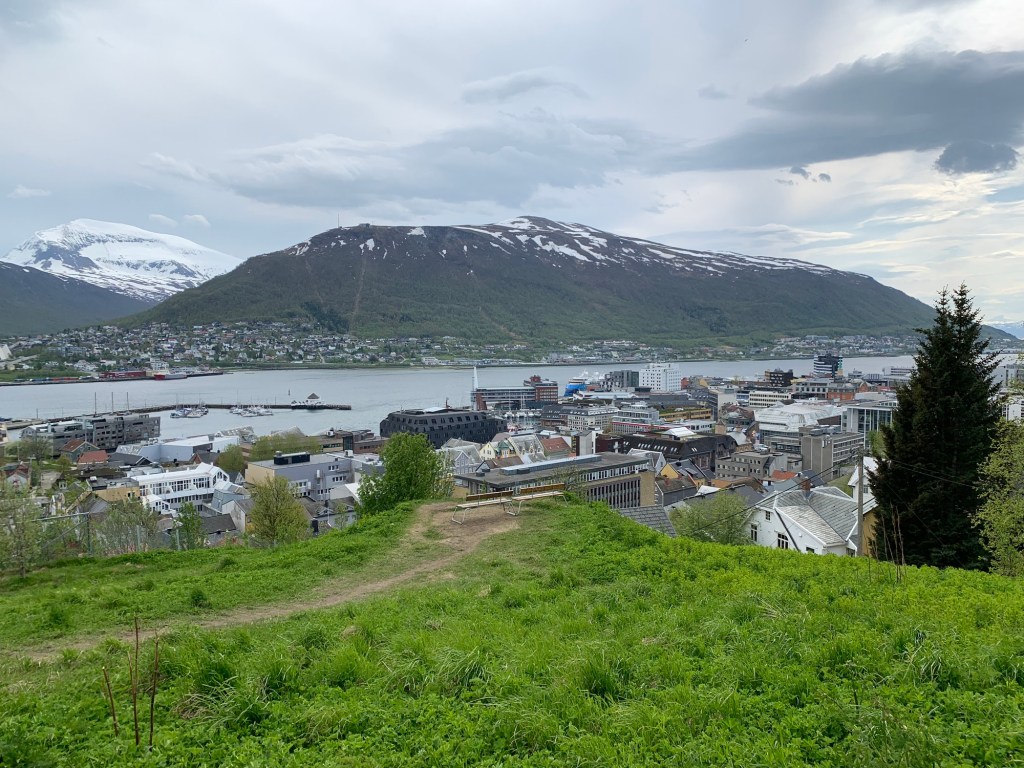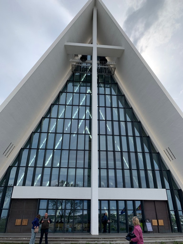 As we left he cheered us up by saying we could spend more time at our next stop – The Arctic Cathedral *actually a Lutheran Church, but often referred to as a Cathedral for tourists. As we got to the door, there was a service on (being Corpus Cristi Sunday) and tourist entry was prohibited. So once again the guide did his best to give us as much information as he could about the church. There is a high bridge (60 meters) between the island and the church which if very windy also is closed, so they also have a tunnel. This part of Norway is all islands so they are very good at building tunnels and bridges. He consulted with the driver and told us that we would be going back through the Tromsøysund tunnel which was 110 meters below sea level. However, just as he was telling us that we started over the bridge! By this point all were amused and all with good humor. He then clarified, that we would be going in the tunnels under the city which had roundabouts and various different branches. We drove through the University with him pointing out the various faculties and stopping at the seafaring faculty for the terrific viewpoint. The mountains were all covered with snow and the views of the fjord and area was spectacular. Very different from yesterday which was rural, today was definitely more Urban. On the way he pointed out the Botanical Garden, the Ski Jumps, vestiges of the Winter Olympics that were held here, the hospital, the faculty that studies the Northern Lights, The King’s house (now the [female] Bishop’s house) and other key places, before going to the center of Town.