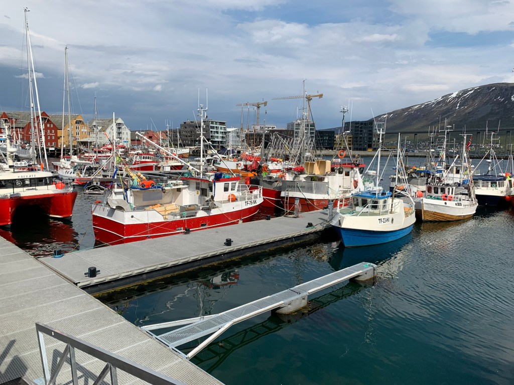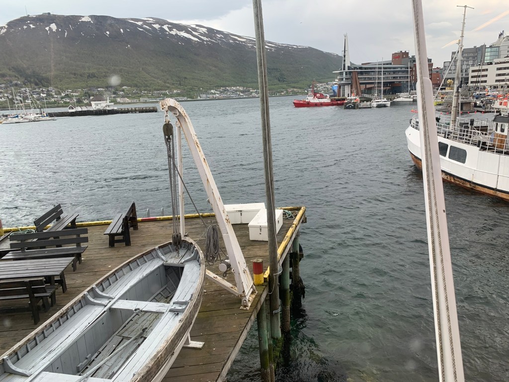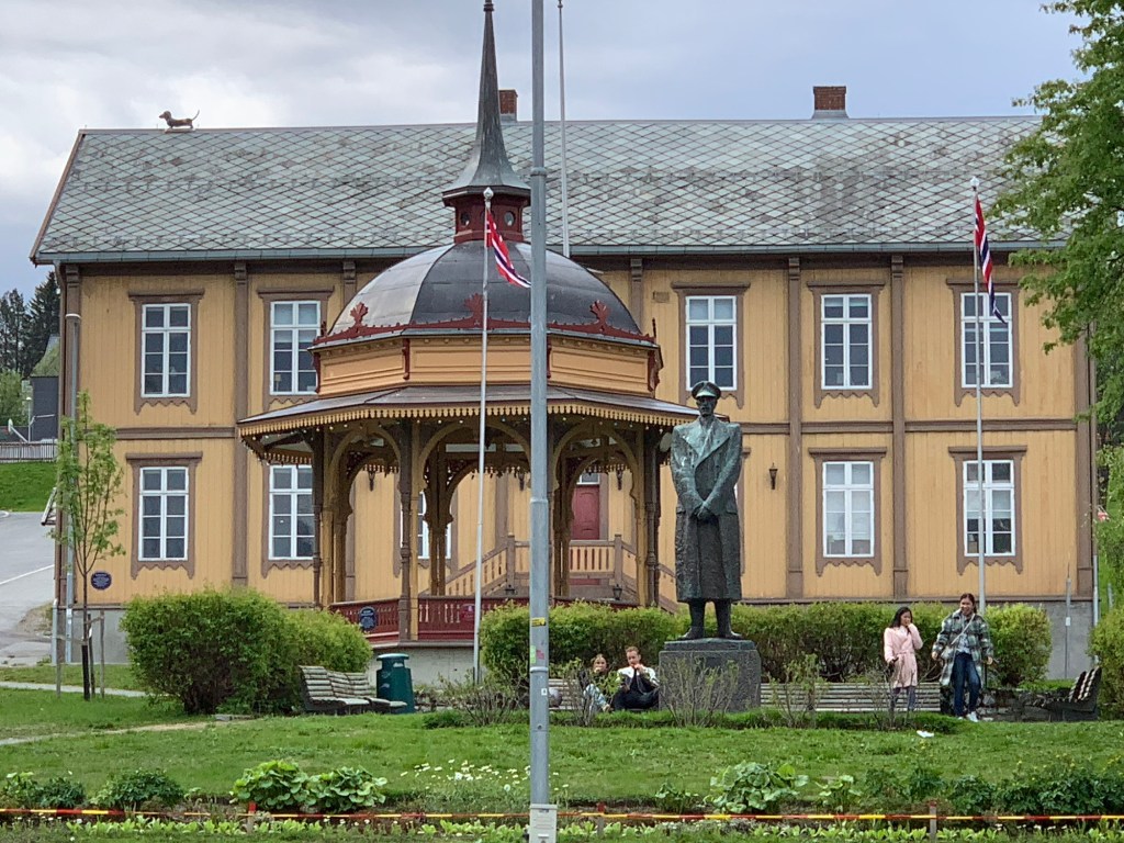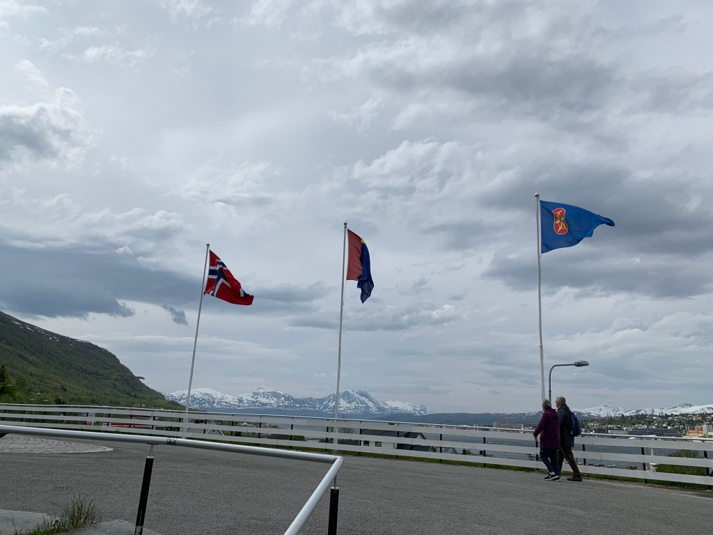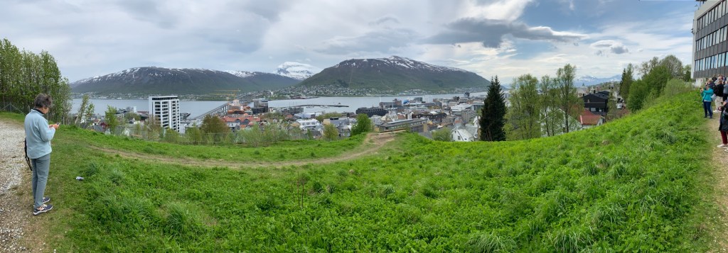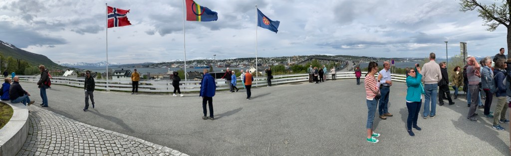 Overnight there was no darkness as we did not turn off the light until nearly midnight last night and the sun was still high in the sky. We woke at 2AM and 4AM and it was still bright sunshine. The sun seems to get close to the horizon and then appears to bounce back into the sky, never going below the ocean. This will be even more pronounced tomorrow as we hear further North to Honningsvåg. We docked Starboard to dock in a semi commercial port at the Breivik berth, although there was a small “pop-up” pair of shops after exiting the secure perimeter, one with attire, mainly sweaters and the other with trinkets many of which seemed to be made by the local indigenous people – the Sami’s. They have their own language and indeed government and originated from Russia, but have been on the land much before the Vikings. Their flag Large red swath followed by narrow green then yellow stripes and the largest swath blue. A black circle is in the center and goes around all four colors. The size of the blue is roughly equivalent to the other three combined, with the red equivalent to 3 times the yellow plus green stripes combined. There is another indigenous group that traces it’s origins to Finland and are even a smaller minority than the Sami’s. Tromsø (called “Romssa suohkan” in Sami) is located at about 70 degrees North so well within the Arctic Circle (defined as 66 degrees 30’ N) and thus the endless light during the summer and the total darkness other than an hour or so of twilight a day in the winter, where the Northern Lights provide the excitement and light. It was established formally on January 1st, 1838 and has a population just under 80,000. However, the area has been inhabited since the last Ice age with archaeological evidence dating to 9,000 years ago. The Norse chieftain Ohthere in the 890’s lived here as did the Vikings and became the Northernmost dividing line between the Norse / Norwegian and Sami people. However, there have been finds of the Sami South of this “line”. The first church on Tromsøya Island was erected in 1252 (Ecclesia Mariae de Trums juxta pagans – The Church of Saint Mary in Troms near the Heathens) withe the “heathens” being the Sami. At the time, it was the Northernmost church in the world. Also ramparts were built to protect against the Russians as there is a border between the two countries nearby. On June 20th, 1794. Tromsø was issued a City charter by King Christian VII despite only having a population of 80 people. This was to reduce the dominance of Bergen’s monopoly of the Cod trade. Tromsø rapidly gained importance due to Codfish and by 1804 a Bishop Mathias Bonsak Krog came to Tromsø and established. Northern diocese. By 1850 it became a major city for Arctic Hunting, In 1848 a teacher training college was formed with the Tromsø museum being established in 1872 and the Mack brewery n 1877. We, of course, had to sample the Mack beer, that still dominates the local market, witch came in light and dark and was found to be of excellent quality. In the early 1900’s it became a place for arctic explorers to hire people and start their expeditions, with the most famous being Ronald Amundsen. The Northern Lights Observatory was founded in 1926. Germany invaded Norway in 1940 at which point Tromsø became the Capital briefly and the city itself did not suffer great damage. The “highlight” was the destruction of the battleship Tirpitz which was sunk by the RAF on November 12th 1944 in the harbour. In 1964 the Tromsø airport was inaugurated and the Norwegian Polar Institute was moved to Tromsø in 1988 and greater expansion of the University ensued.