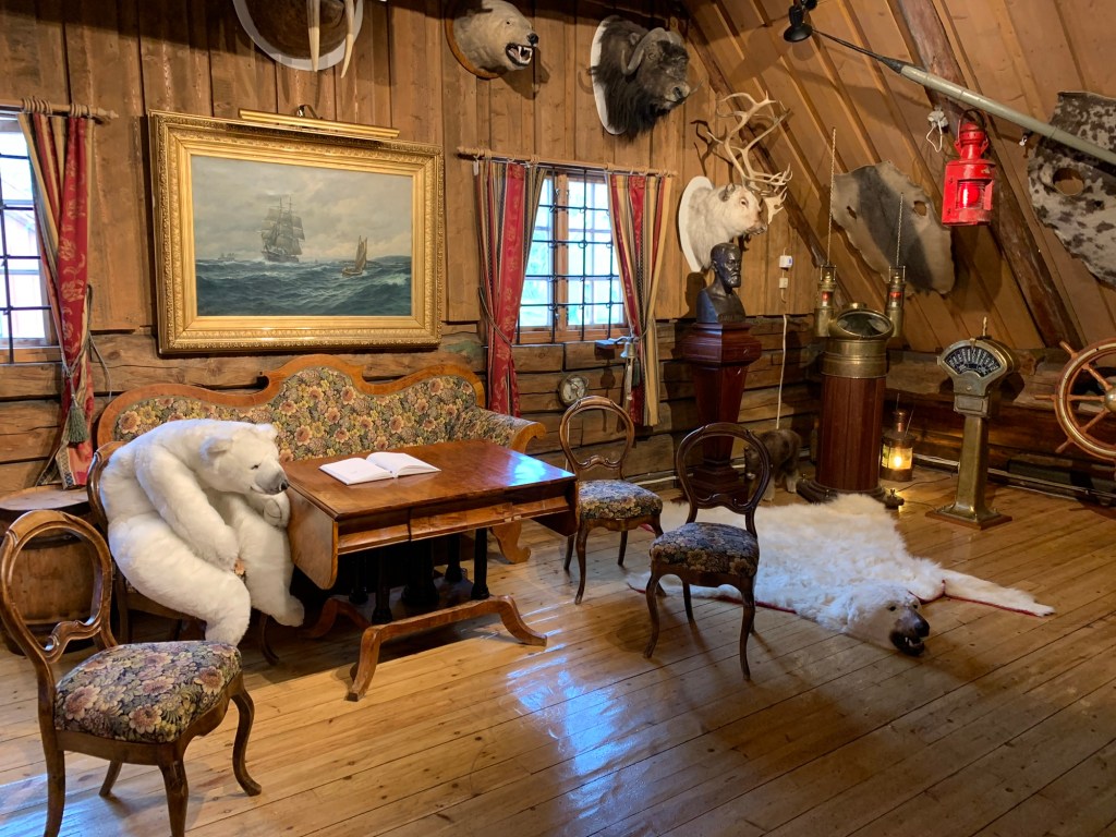 Here we got off the coach and entered the OPEN – Polar Museum. It is in the 1830’s building that was used as the Bonded warehouse by the Customs authorities until the 1970’s. The museum was opened on June 18th 1978 on the 50th anniversary of the fateful flight of the Flying Boat – Latham 47 – that went off on a rescue mission, killing Ronald Amundsen and the other five. A good portion of the second floor is devoted to his expeditions to the North and South Poles. He was the first to sail through the Northern Passage on th Gjøa ship which left Tromsø in 1901, spent much time at the Magnetic North Pole undertaking studies and arrived in Nome Alaska on August 31, 1906. On the vessel Fram, he sailed to Antarctica (although he initially was going to the North Pole, but found that someone had already reached that goal) and he, with 4 of his men, reached the South Pole on December 13th, 1811. Robert Scott (Britain) reached the South Pole on January 18th, 1912, but their whole team died on the way back to base camp. Trapping, Seal, Walrus and Polar Bear hunting and in general life in the Arctic forms the very interesting exhibit. The guide was extremely knowledgeable and explained all in great detail. [The only thing he never explained was his own name!!!].