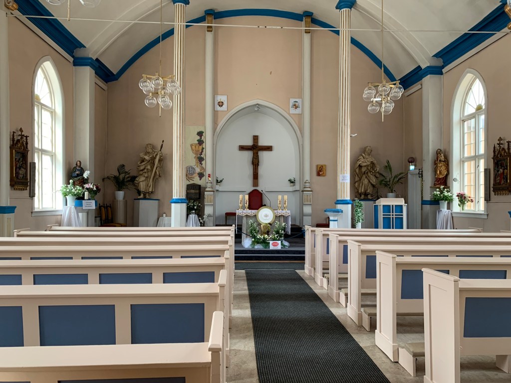 He left us at the shuttle bus location and told us to go to a local fish restaurant which he highly recommended in the center of town, with a great view of then fishermen’s boats and the land beyond. We found Skirri – Kystens-Mathus Restaurant (www.kystensmathus.no) next to the aquarium, but the doors were locked and so our mouths anxious to tase the local King Crab and Cod were once again foiled!! We ended up getting. Sandwich and coffe at the Bakery opposite which we greatly enjoyed. We wandered a bit over the road repairs on the main road that has heated ducts under the road permitting it to remain frost and snow free all winter, until we reached the Catholic Cathedral. A relatively small core painted wooden structure, which we found open and were able to see the nicely, but conservatively / austere decor, with the pipe organ and all made from wood. It being time, we headed back to the Shuttle location where we fortunately boarded the coach just before it returned us to the ship. We had a nice dinner in the min dining room and saw the amazing show – Luminescence with Duo Lyodji (Maud and Hajima) and their almost unbelievable acrobatic performance. The sea conditions by now had picked up a bit and we were moving more than we had done previously.