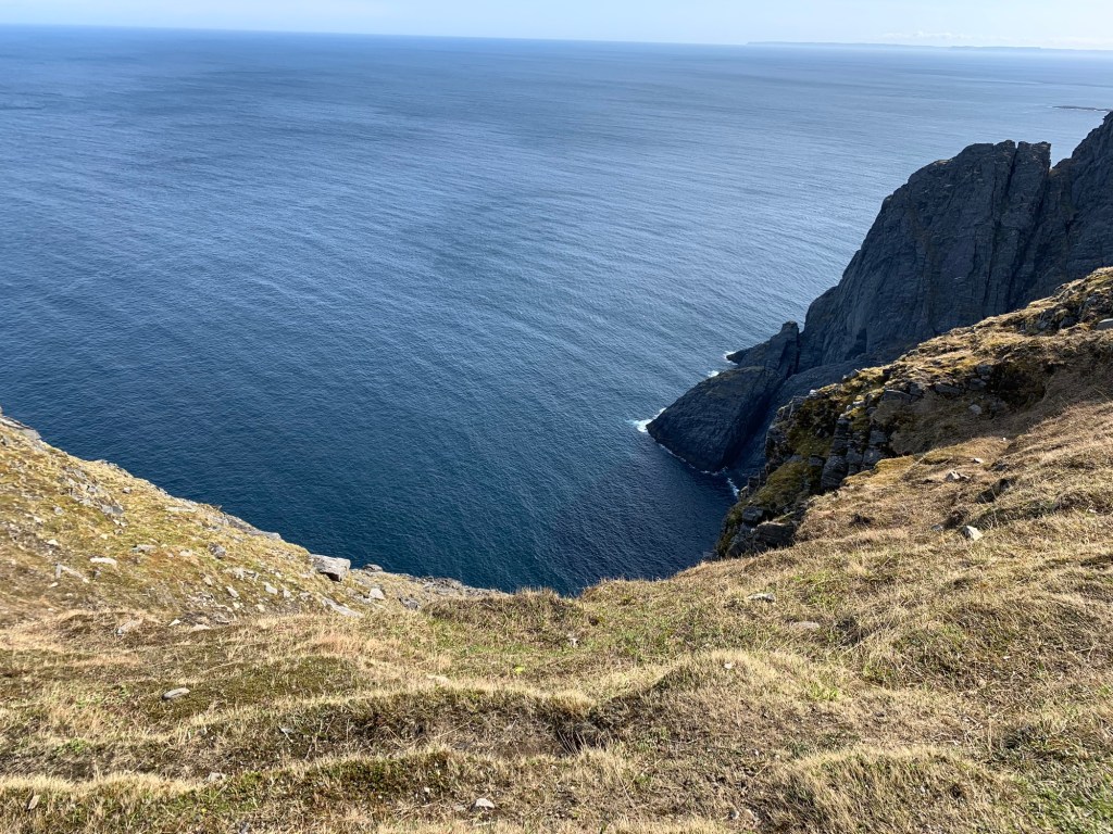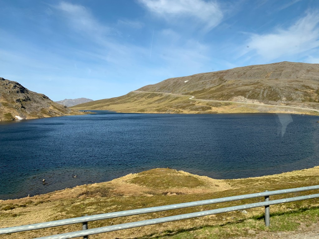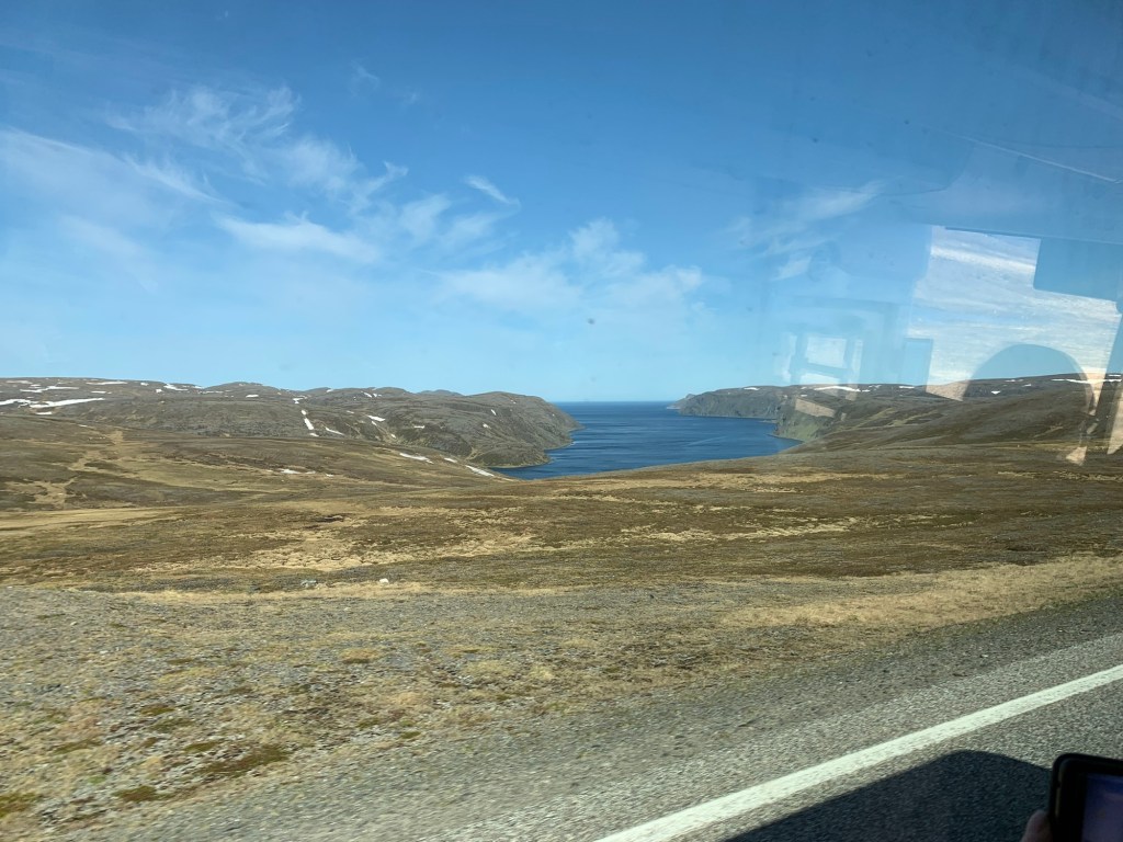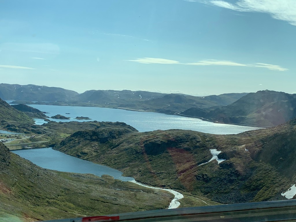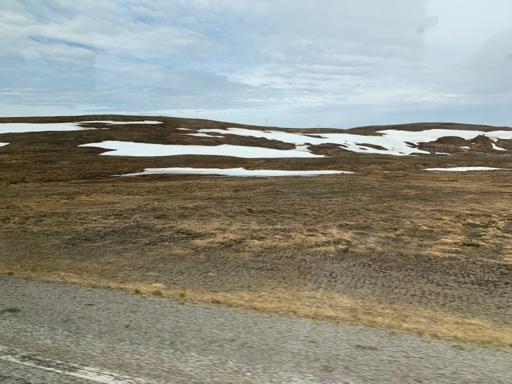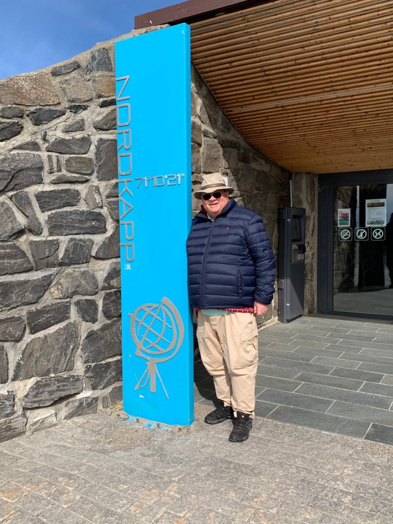 An exciting day today as we reach our most northerly point at 72 degrees Latitude, with the Arctic North Pole being the only thing further North. It’s exciting as over the past couple of years we have been fortunate enough to be close to Antarctica (in April), rounding the southern tip of Africa and South America and traveling through the Suez and Panama canals. What we need now it to tackle the North of Canada with the Northern Passage, to complete the North and South land masses, but that will have to wait. This is the northernmost tip of Europe and significantly North of Iceland, and half way up Greenland. Honnensvåg is a small town (officially a City as of 1996) on the island of Magerøya located in the Eastern Finmark area of Northern Norway on the southern Barents Sea. It has a sheltered harbour allowing cruise ships ow to dock at the newly constructed, small dock in the center of town. In 2012, Roger was here and it was a bit of a nightmare as the Queen Mary had to drop anchor and have tenders manage the very rough seas causing a delay of 3 hours as the wave conditions were unsafe, the coach broke down going to North Cape, leaving us stranded by the side of the road for an hour, and the weather was poor allowing virtually no visibility of the key feature – Nordkapp – North Cape. Today, it was a gorgeous sunny day so we were able to enjoy the entire trip a lot more. We boarded what we thought was a tour coach, but was actually just a transfer from Honningsvåg to Nordkapp. The scenery over the one hour drive through the mountains was spectacular. A lot of snow was all over, slowly melting and forming little lakes in the depressions. All were sheer rocks with precipitous drops in places to the sea. Lichens and moss covered the ground, but no shrubs, trees or anything taller than ground moss did not exist. We did see a few reindeer and sea birds, but otherwise it was impressive due to it’s “nothing-ness”.