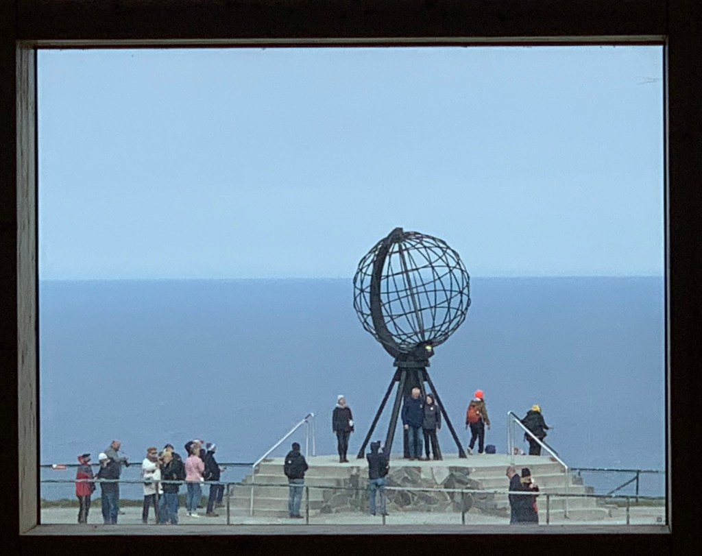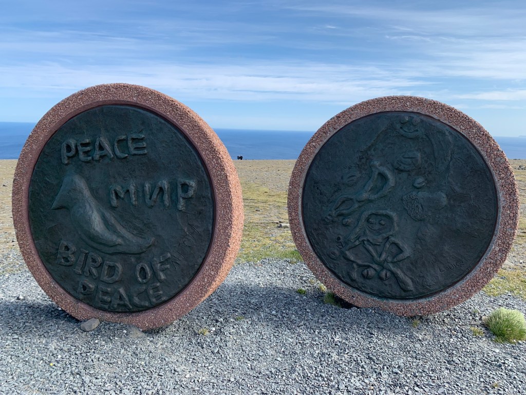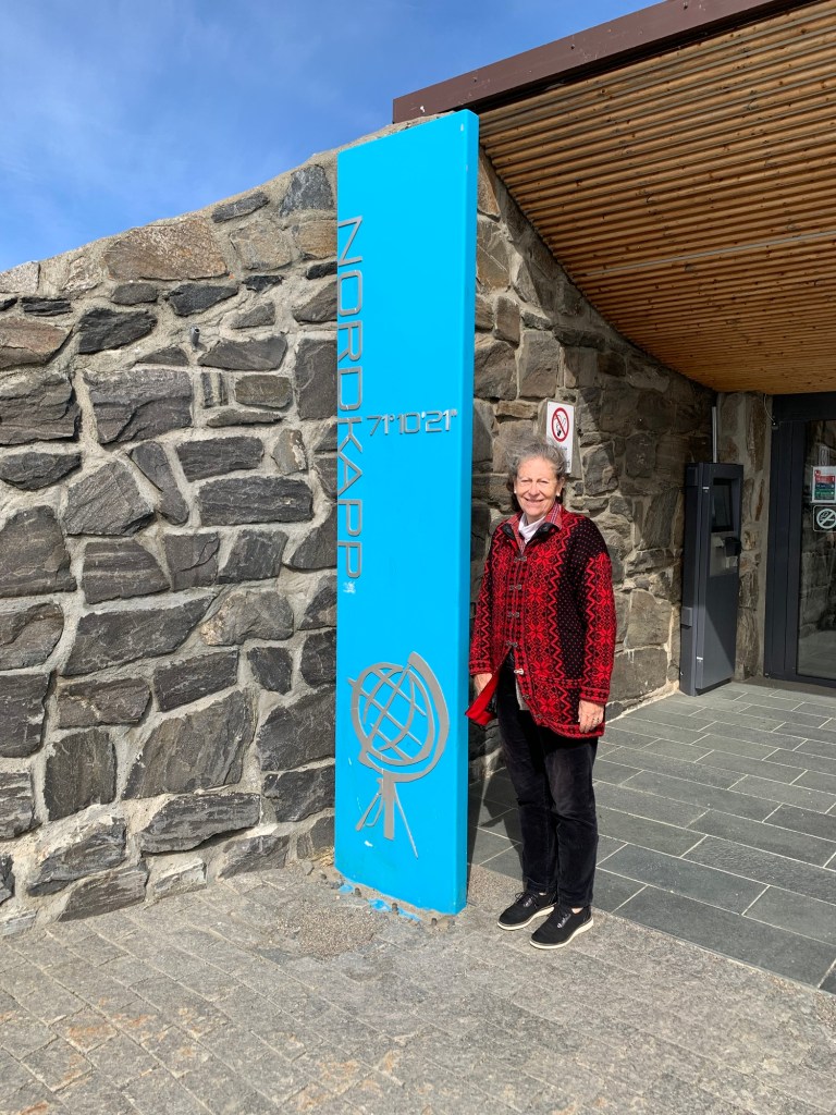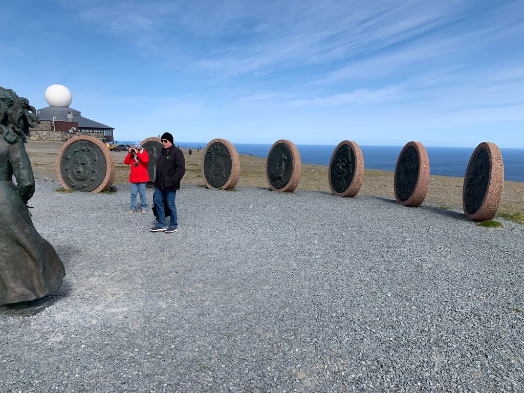 Arriving at the North Cape (Nordkapp) located at 71 degrees 10’ 21” North, there is a thriving and interesting set of buildings and structures. Entering from the parking lot one is greeted with a large cafeteria restaurant and panorama bar, to the right located under a weather station dome, an extensive gift shop to the left, and in front of you a large window wall overlooking the end of the Cape and the globe like statue, erected in 1977, that marks the northernmost spot and is the symbol of Nordkapp. Located within the complex are a number of indoor activities. This makes a lot of sense as often there is rain, Fog, clouds and visibility is greatly reduced. A continuous Cinema show takes 20 minutes and explains the seasons around Nordkapp. A tunnel under the rock, explains the story behind the location and important visitors who have arrived there. These dioramas and explanations in various languages are excellent. There is a small ecumenical Christian chapel dedicated to St. Johannes, The Thai Museum (actually one room dedicated to the memory of King Chulalongkorn of Siam (Thailand) who visited Nordkapp in 1907 and at the end – The Cave of Lights. Steps allow you to sit and watch on the screen and cave walls a 7 minute light show taking you through the seasons. There is also a room that gives you the history of the North Cape since 1533. Although we did not see it, we believe there is a viewing area that can be reached ousted the cave as we saw what appeared to be a balustrade and open area when we wandered around on top of this cave, near the globe symbol. A Post Office is there to send letters proving you were there as well as certificates also proving you were there and making you a member to the Royal North Cape Club which allows you the privilege of returning to the place for free, for the rest of your life! The purpose of the club is to take care of the North Cape. One other feature that is well worth seeing is the “Children of the World” Monument. This consists of a sculpture of a woman and child pointing at seven stone circles, like enormous coins (each 6+ feet in diameter and 18 inches wide) standing upright in a semi-Circle with the Ocean behind. Each of the seven circles reflects a design made by the children from around the world. They symbolize – Collaboration, Friendship, Hope, and Happiness across al borders. The monument was unveiled in 1989 and ever since the “Children of the World” Prize has been awarded, with a generous sum of money, to an organization or project that works to improve the conditions of children.