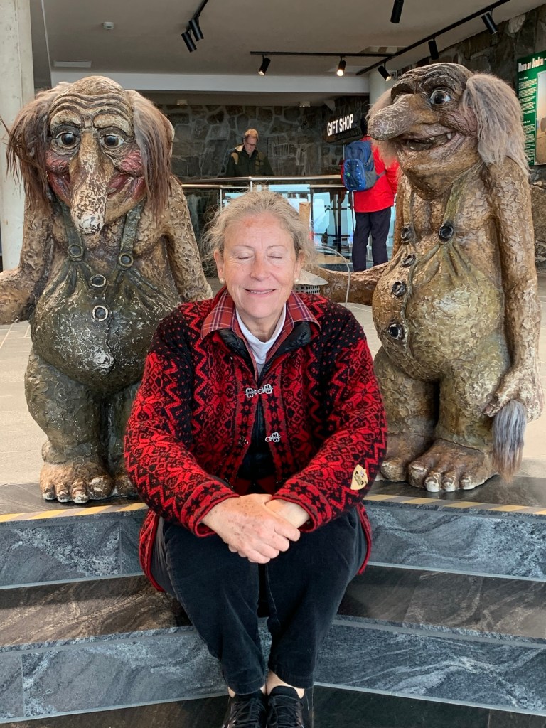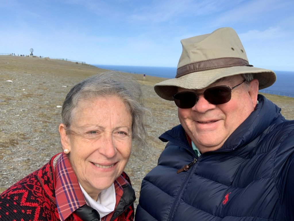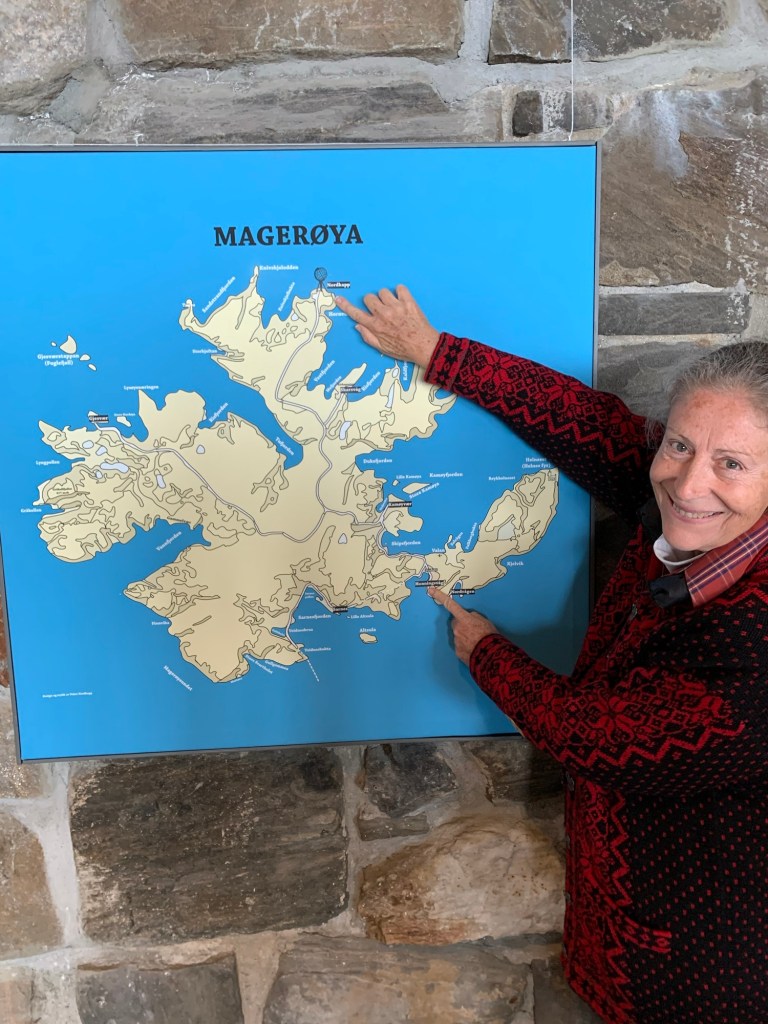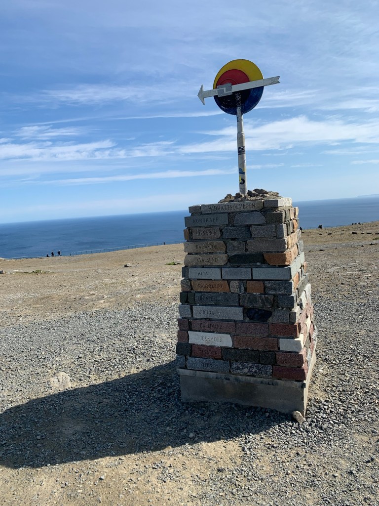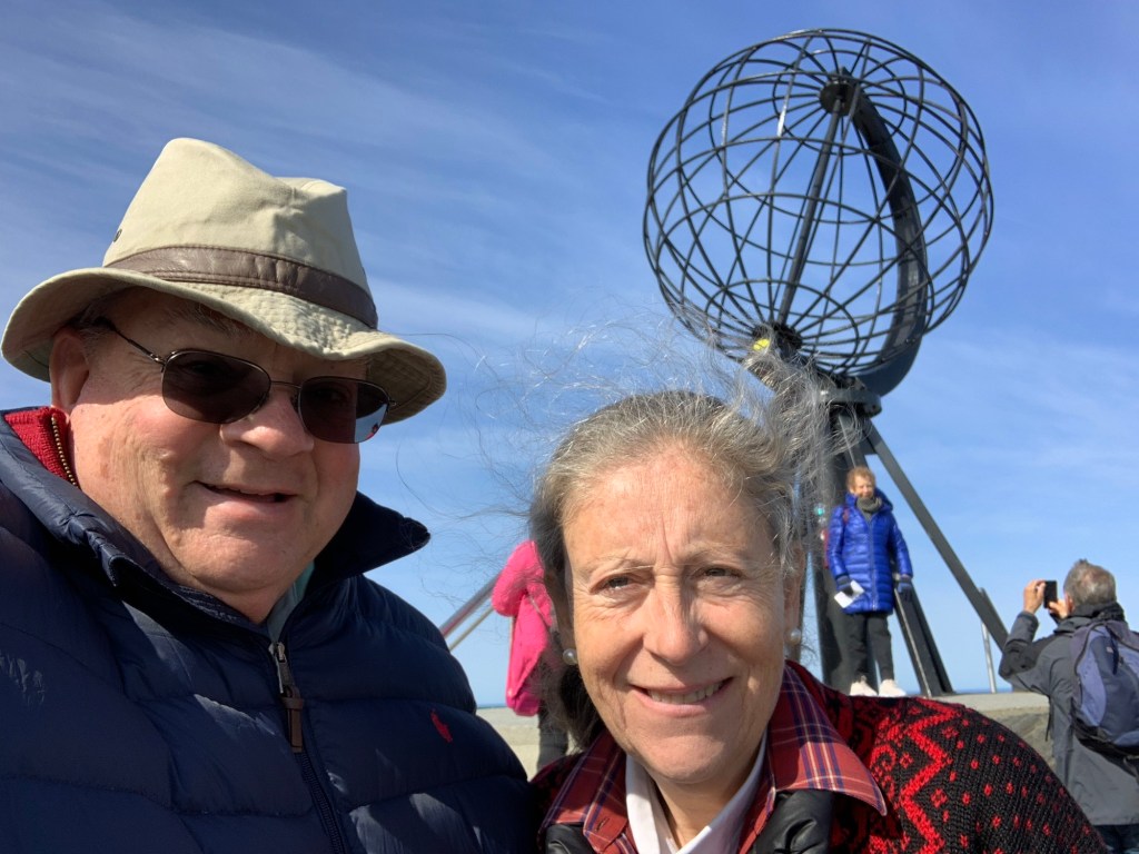 Arriving at the North Cape (Nordkapp) located at 71 degrees 10’ 21” North, there is a thriving and interesting set of buildings and structures. Entering from the parking lot one is greeted with a large cafeteria restaurant and panorama bar, to the right located under a weather station dome, an extensive gift shop to the left, and in front of you a large window wall overlooking the end of the Cape and the globe like statue, erected in 1977, that marks the northernmost spot and is the symbol of Nordkapp. Located within the complex are a number of indoor activities. This makes a lot of sense as often there is rain, Fog, clouds and visibility is greatly reduced. A continuous Cinema show takes 20 minutes and explains the seasons around Nordkapp. A tunnel under the rock, explains the story behind the location and important visitors who have arrived there. These dioramas and explanations in various languages are excellent. There is a small ecumenical Christian chapel dedicated to St. Johannes, The Thai Museum (actually one room dedicated to the memory of King Chulalongkorn of Siam (Thailand) who visited Nordkapp in 1907 and at the end – The Cave of Lights. Steps allow you to sit and watch on the screen and cave walls a 7 minute light show taking you through the seasons. There is also a room that gives you the history of the North Cape since 1533. Although we did not see it, we believe there is a viewing area that can be reached ousted the cave as we saw what appeared to be a balustrade and open area when we wandered around on top of this cave, near the globe symbol. A Post Office is there to send letters proving you were there as well as certificates also proving you were there and making you a member to the Royal North Cape Club which allows you the privilege of returning to the place for free, for the rest of your life! The purpose of the club is to take care of the North Cape. One other feature that is well worth seeing is the “Children of the World” Monument. This consists of a sculpture of a woman and child pointing at seven stone circles, like enormous coins (each 6+ feet in diameter and 18 inches wide) standing upright in a semi-Circle with the Ocean behind. Each of the seven circles reflects a design made by the children from around the world. They symbolize – Collaboration, Friendship, Hope, and Happiness across al borders. The monument was unveiled in 1989 and ever since the “Children of the World” Prize has been awarded, with a generous sum of money, to an organization or project that works to improve the conditions of children.