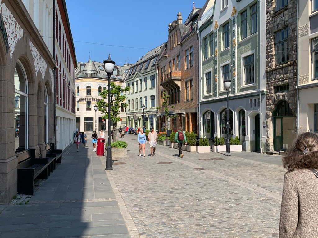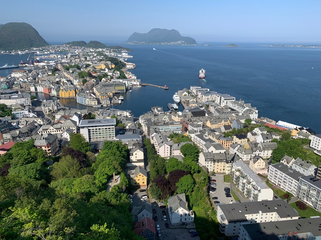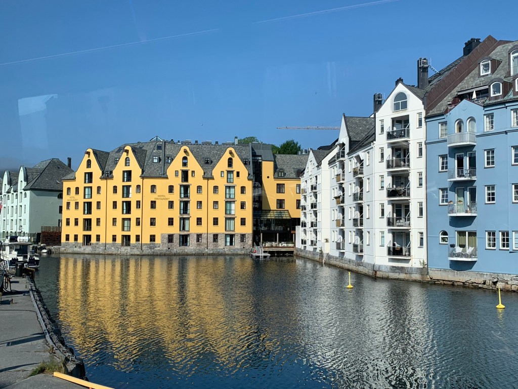 Ålesund (the Å is pronounced O) has been called the most attractive city in Norway and to a certain extent with good reason. A fire on January 23, 1904 destroyed 80% of the city (850 houses) in one night. It has been rebuilt with the center of the city all with similar style (Art Nouveau Atchitecture) and in stone with wider streets. Outside the fire zone marked with a flame on a building where it began and another flame in a park at the other end, the houses are still made of wood, the streets are narrow and still date to before the fire. Newer buildings since then outside the central core, do not have to adhere to the strict building codes. No changes can be made to anything in the buildings. It provides a charming scene all along the river.