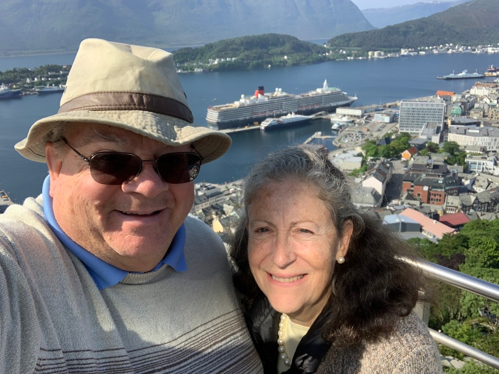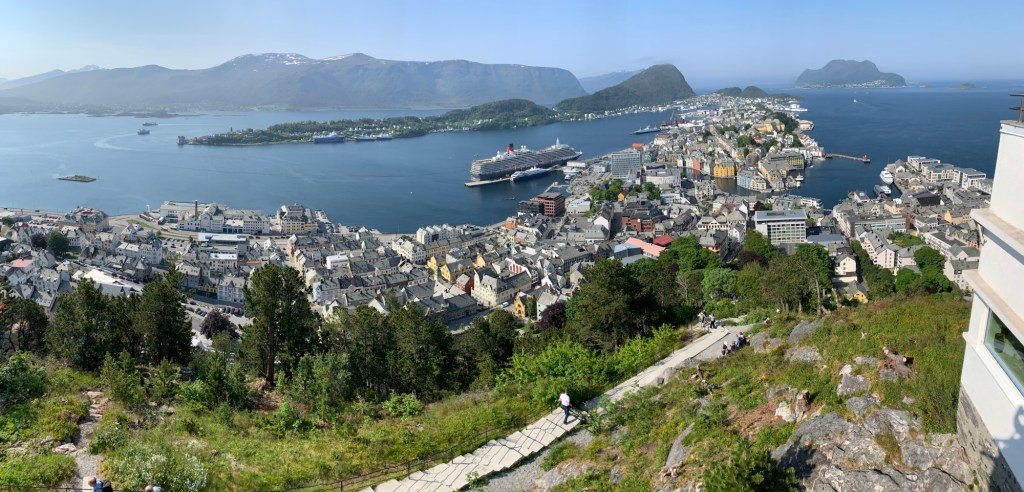 The ship docked, Starboard to dock right in the middle of town thus allowing all to wander into the center of town without the need of shuttle buses. It is always really nice when you can walk to and from the ship to the restaurants and shops. However before we went into town we boarded the coach (Right Hand Drive) for a tour – Leisurely Ålesund and our Italian Guide – Valentina, introduced herself. She was good, but as a foreigner was somewhat “belittling / syndicalism” of some of the local customs. For example there is a tradition to light a large bonfire to welcome the start of daylight. Her comment was – How do people whose city was destroyed by fire celebrate by building the largest bonfire in the world! It was formally established on January 1, 1838 with 482 inhabitants although there was a small port dating back to 1793, and now has a population of over 60,000. It is located on seven islands with the town center on Aspøya and Nørvøya with Heissa and Osknøya being the residential areas. It is one of the most important Herring fishing ports in the country. It used to be a major ship-building location but now tends to be ship repair, particularly servicing not only the fishing fleet, but also the North Sea Ocean Oil Fleet.